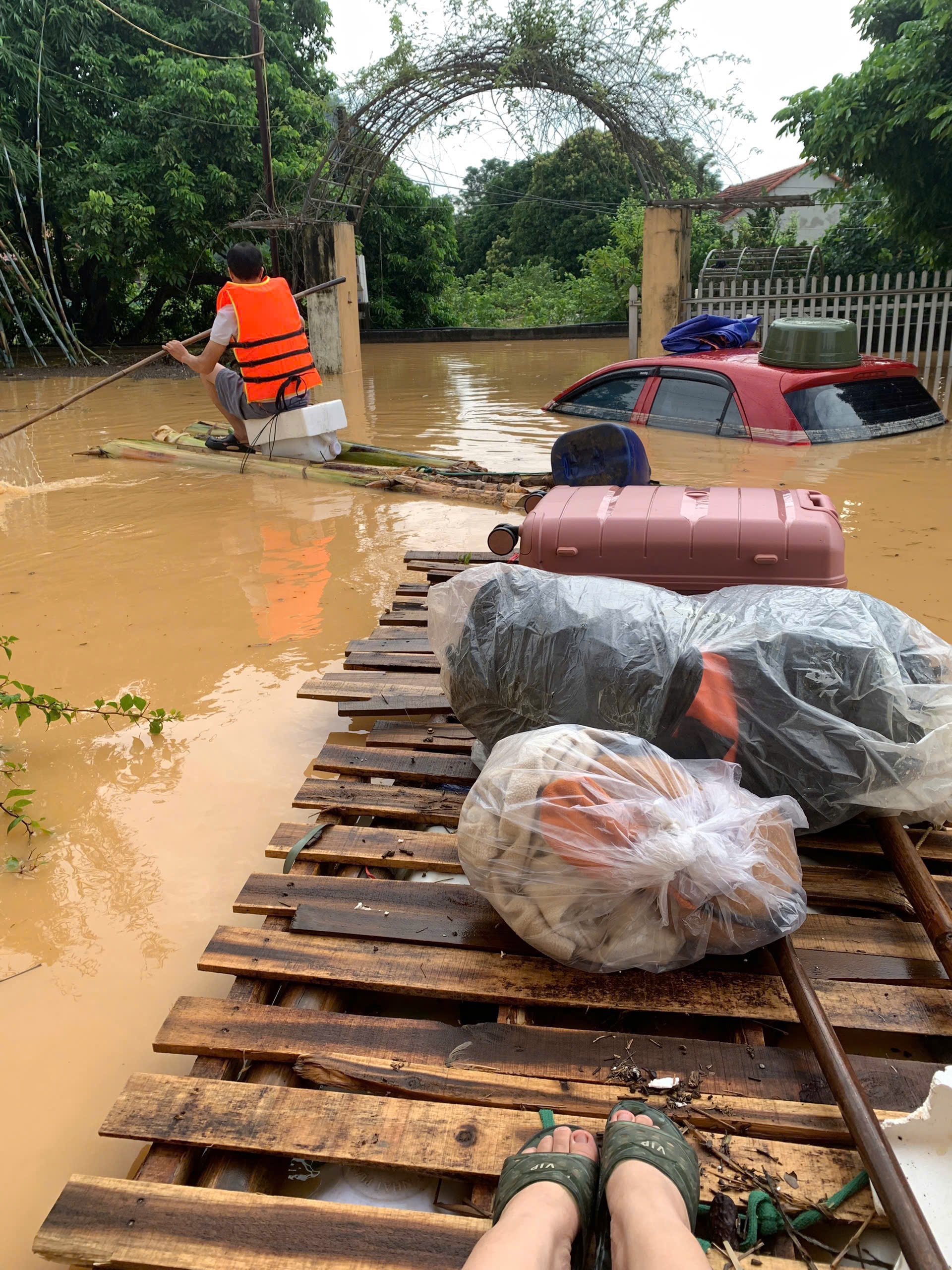Tuy nhiên, những cơn mưa như trút liên tục dội xuống. Đến 6h30 ngày 7/10, nước đã ngập đến cổng nhà Quyên rồi dâng lên theo từng phút. Thấy tình hình nghiêm trọng, bố Quyên, ông Hoàng Đình Nghệ (sinh năm 1978), nhanh chóng kết một chiếc bè đơn giản, cùng các thành viên dọn dẹp, di dời tài sản lên cao.