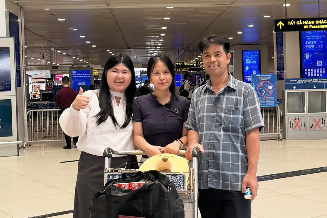 Ông Nghĩa mượn được bộ quần áo khô của người quen, tiễn con gái út (giữa) ở sân bay.