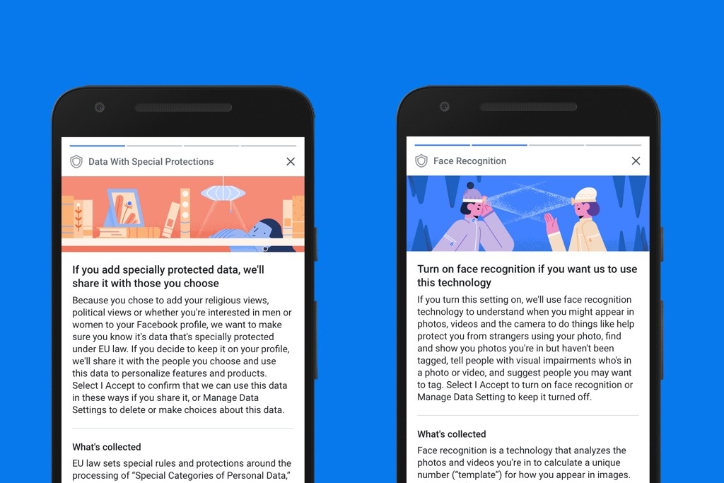 Facebook (sau này là Meta) cũng có những thay đổi ngay khi GDPR có hiệu lực vào tháng 5/2018. Ví dụ, người dùng được yêu cầu kiểm tra và chấp thuận một số hành động, chẳng hạn như theo dõi hành vi để tùy biến quảng cáo, tiếp tục chia sẻ tình trạng hôn nhân, sử dụng công nghệ nhận diện khuôn mặt và chấp nhận các điều khoản mới.