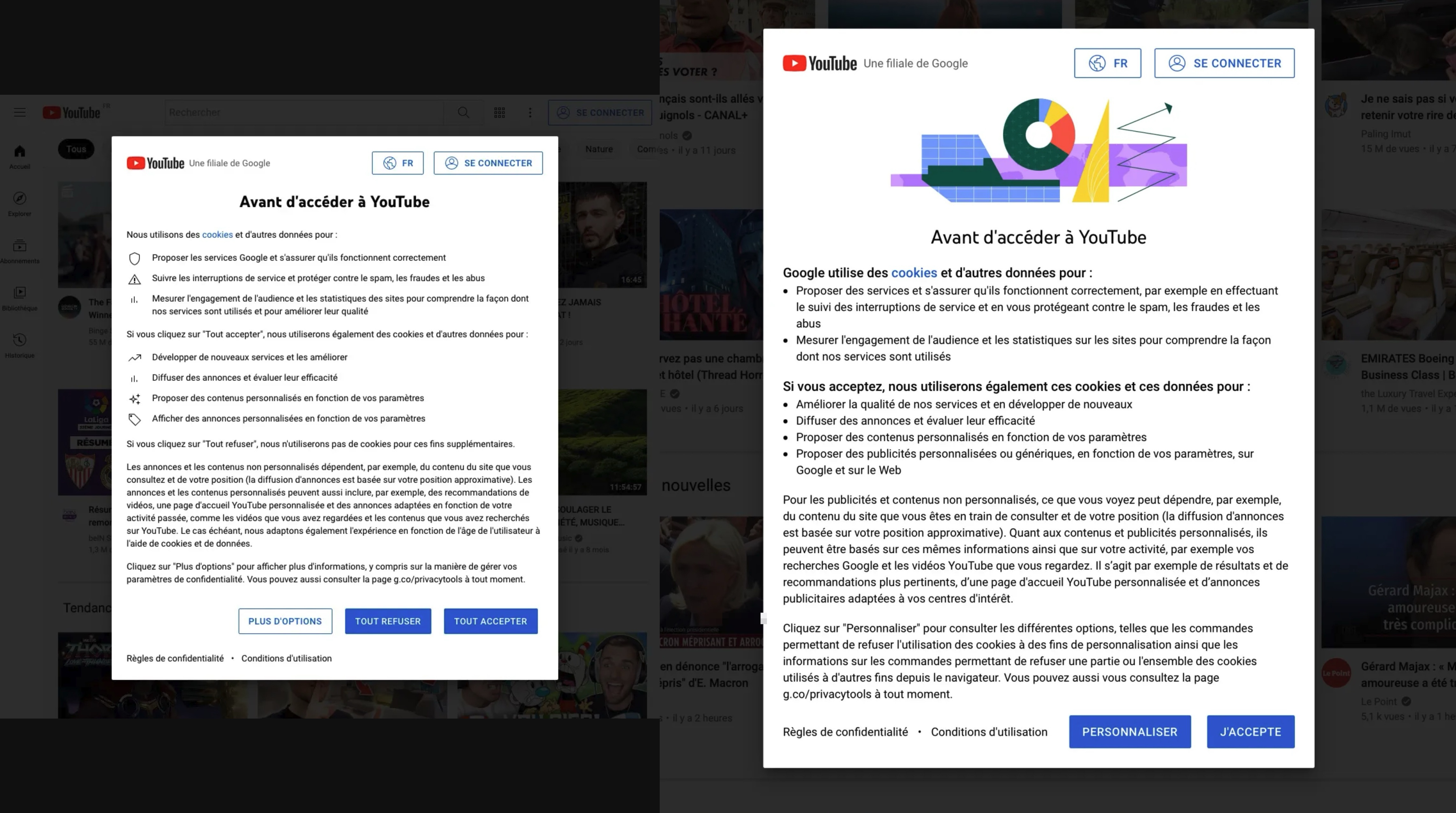 Hộp thoại xin thu thập cookie trên YouTube cập nhật năm 2022 (trái) với việc bổ sung nút "không chấp nhận tất cả". Ảnh: Google.