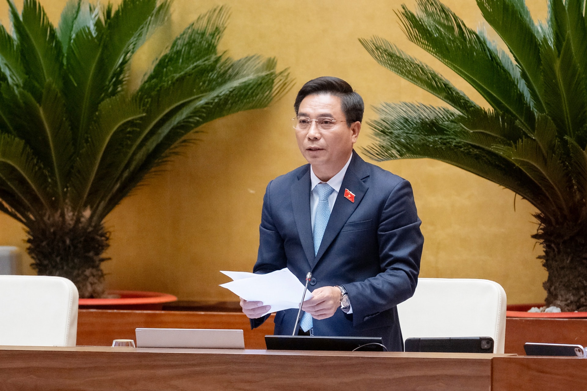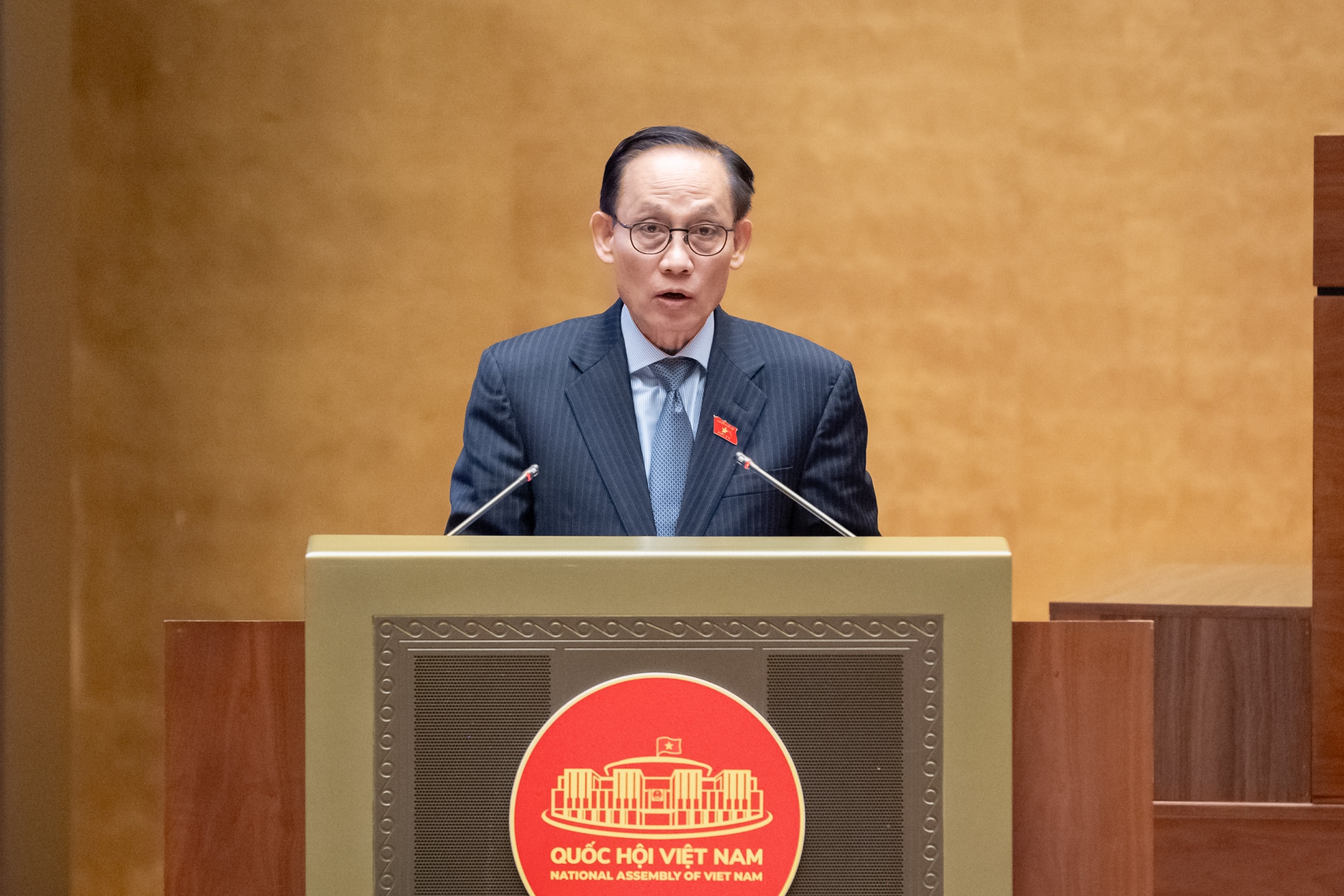 Bộ trưởng Bộ Ngoại giao Lê Hoài Trung trình bày Báo cáo giải trình, tiếp thu, chỉnh lý, hoàn thiện dự thảo Luật. Ảnh: Phạm Thắng