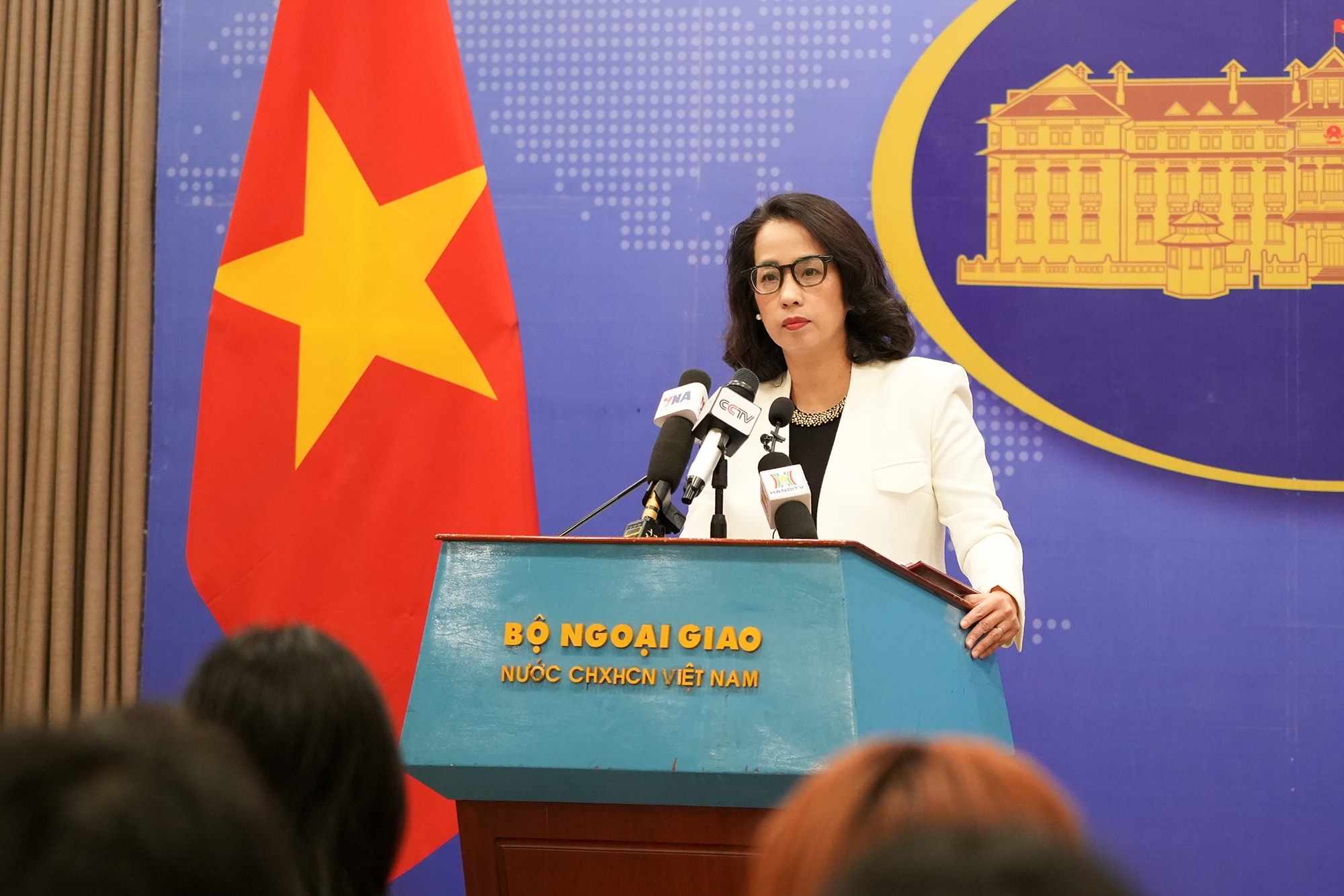 Người phát ngôn Bộ Ngoại giao Phạm Thu Hằng tại họp báo chiều 23-4. Ảnh: Hoàng Linh