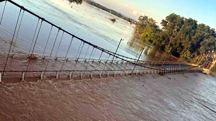 Nước lũ tràn lên cầu Hà Châu (Thái Nguyên) - Ảnh: PLO