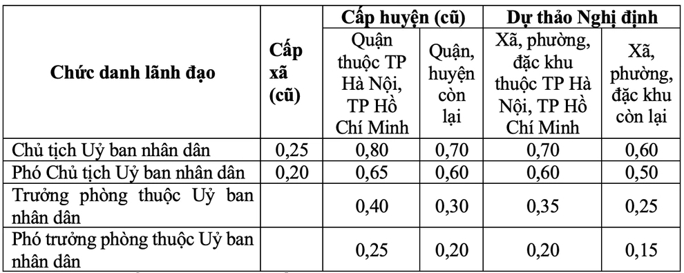 Theo đó, căn cứ danh mục vị trí chức danh, nhóm chức danh, chức vụ lãnh đạo của hệ thống chính trị quy định tại Quy định số 368-QĐ/TW của Bộ Chính trị, cơ quan chủ trì soạn thảo quy định thành 2 mức đối với từng chức danh: các xã, phường, đặc khu thuộc TP Hà Nội, TP.HCM và các xã, phường, đặc khu còn lại. Đồng thời dự thảo nghị định quy định mức phụ cấp chức vụ lãnh đạo cấp xã mới thấp hơn 0,05 - 0,1 so với cấp huyện cũ.