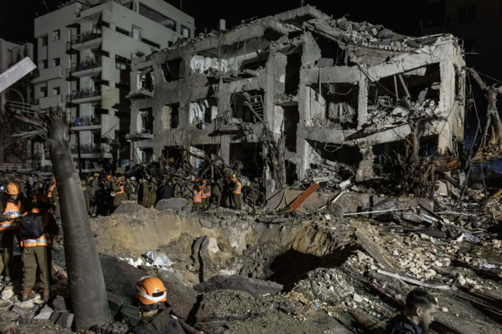 Hiện trường một tòa nhà bị hư hại ở Tel Aviv sau khi tên lửa đạn đạo Iran tập kích nhiều khu vực trong thành phố. (Nguồn: The New York Times)
