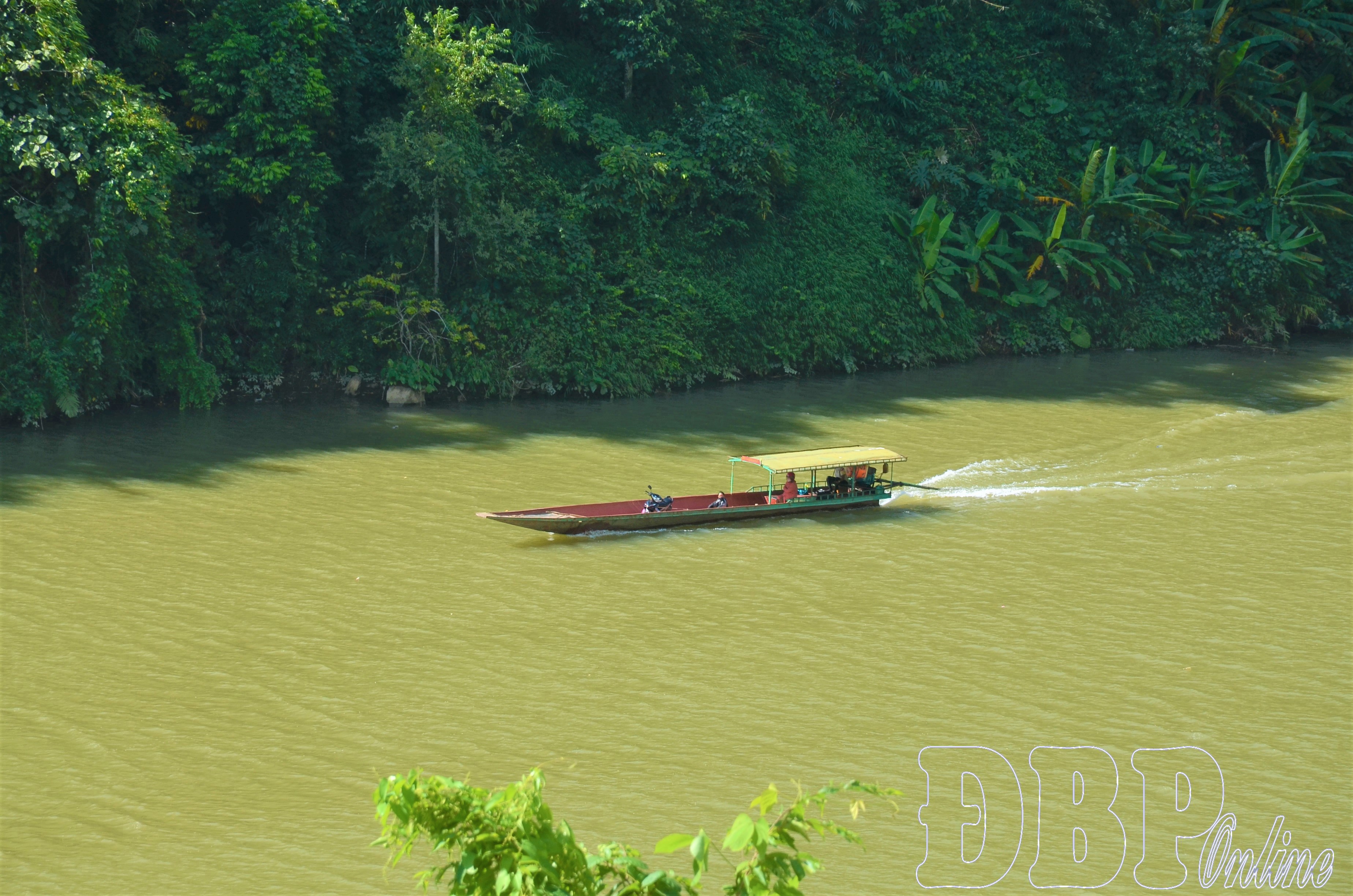 Người dân bản Hin di chuyển đến diện tích nương bằng xuồng máy từ khi lòng hồ thủy điện Nậm Mức tích nước.