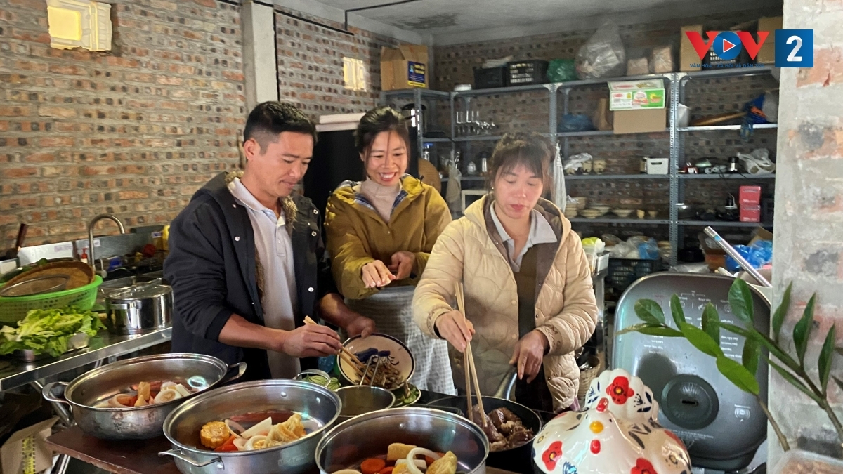 Khi khách đông, Chuyền, người thợ đa năng trong thôn (bên trái ảnh) có thể vào bếp hỗ trợ công việc cùng Trần Thị Nữ (ở giữa ảnh) và Hoàng Thị Hà (bên phải ảnh)