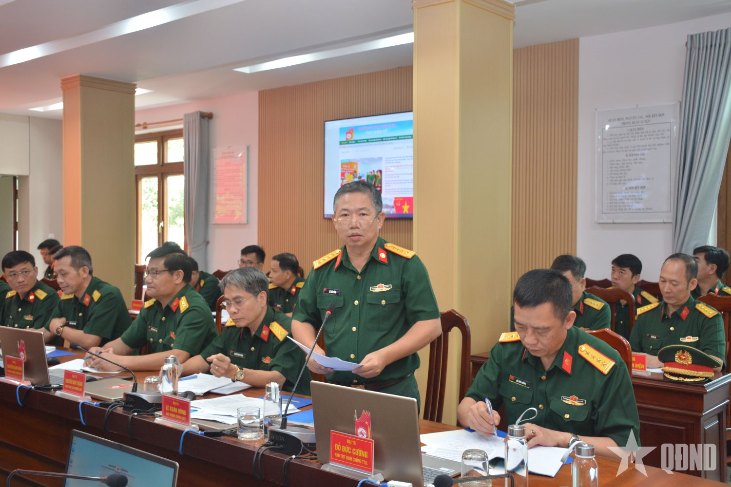 Đại tá Lê Xuân Hùng, Hiệu trưởng Trường Sĩ quan Thông tin báo cáo kết quả thực hiện nhiệm vụ thời gian qua.