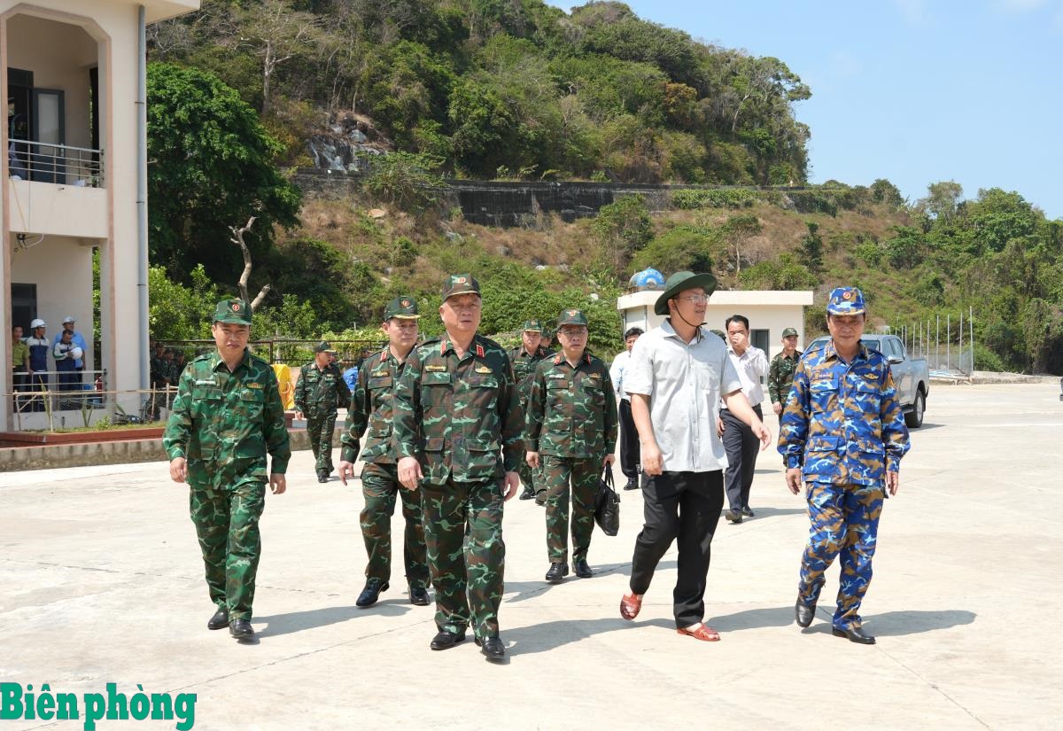 Thượng tướng Nguyễn Quang Ngọc và đoàn công tác kiểm tra trên đảo Hòn Khoai. Ảnh: Hoàng Tá
