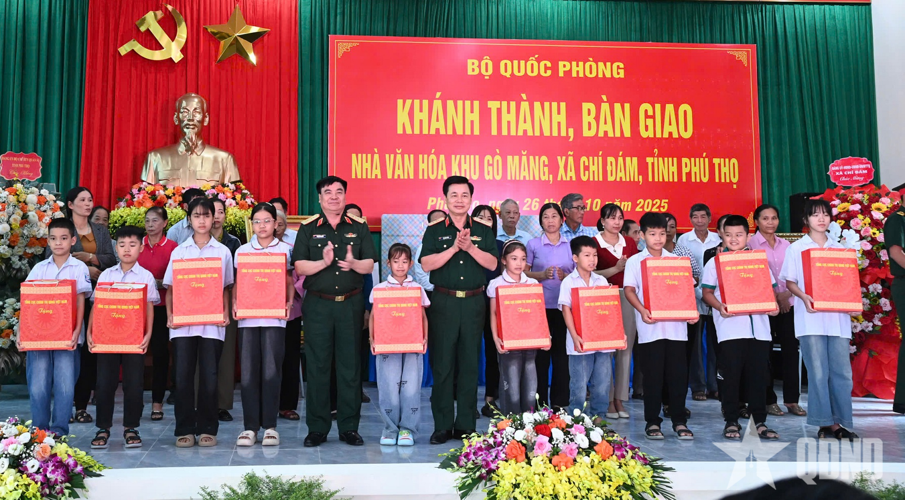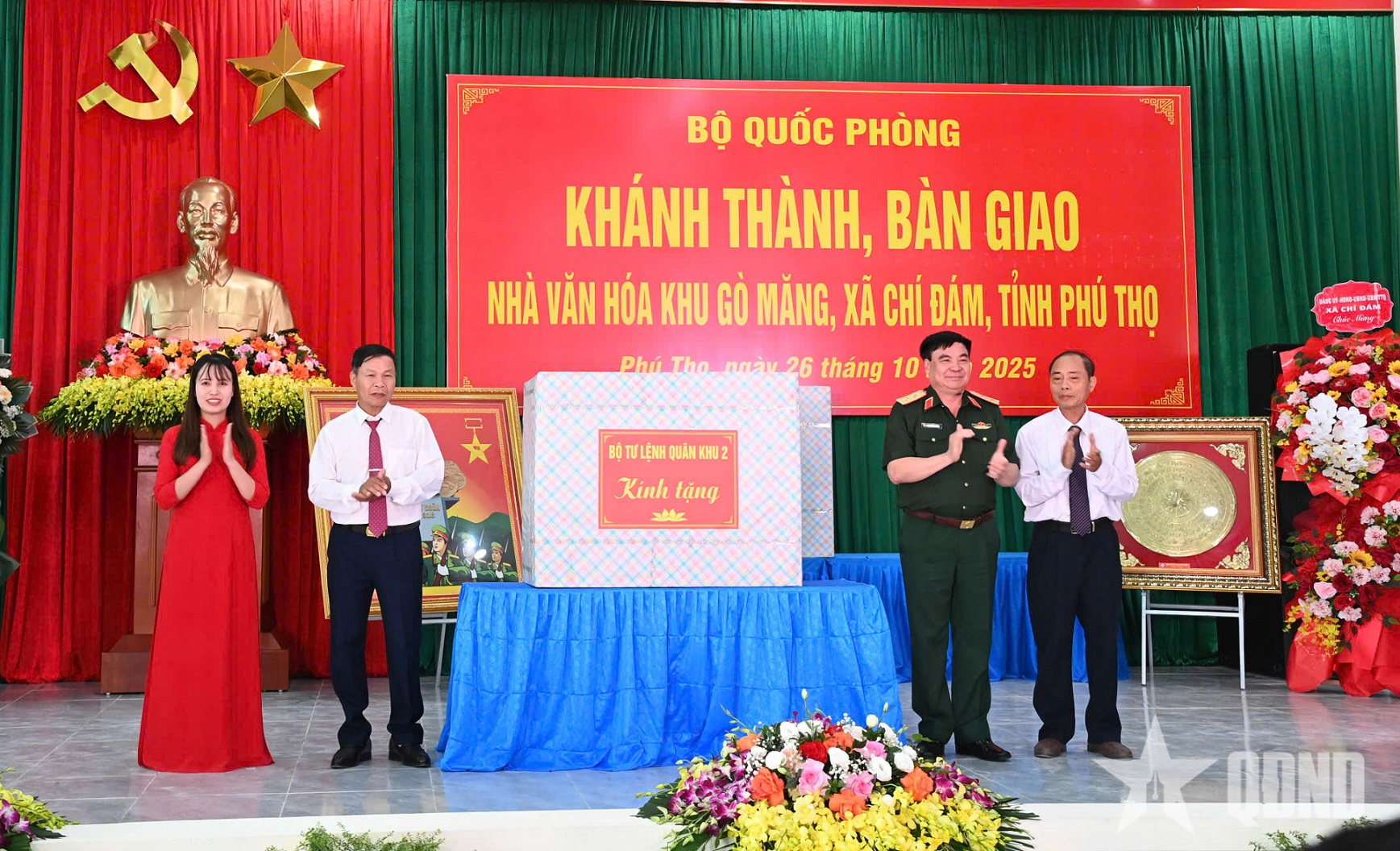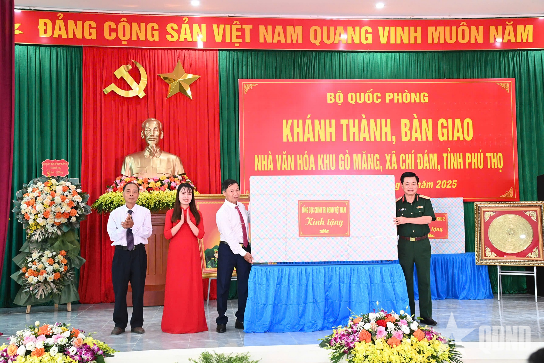 Trung tướng Đỗ Xuân Tụng, Phó chủ nhiệm Tổng cục Chính trị Quân đội nhân dân Việt Nam trao quà của Tổng cục Chính trị tặng Nhà văn hóa khu Gò Măng.