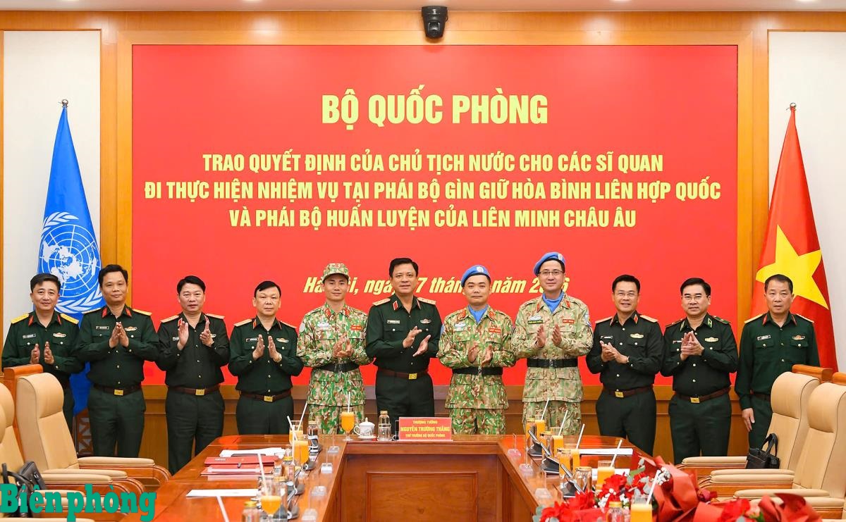 Thượng tướng Nguyễn Trường Thắng trao Quyết định của Chủ tịch nước cho Trung tá Nguyễn Ngọc Linh và Trung tá Trần Thái Sơn đi làm nhiệm vụ gìn giữ hòa bình Liên hợp quốc. Ảnh: Hồng Pha
