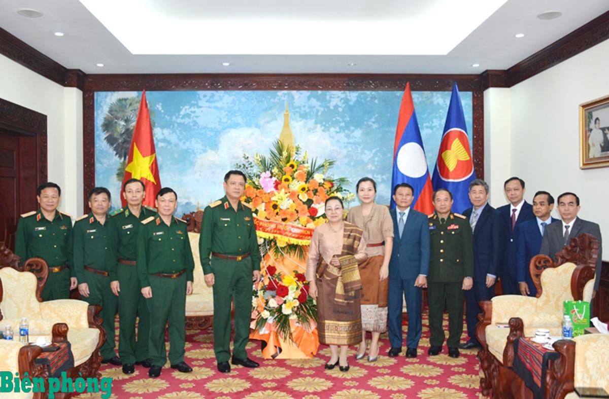 Thượng tướng Nguyễn Trường Thắng cùng các đại biểu Bộ Quốc phòng Việt Nam chúc mừng Đại sứ quán nước Cộng hòa Dân chủ nhân dân Lào tại Việt Nam nhân dịp Tết cổ truyền Bunpimay của Lào. Ảnh: Hồng Pha
