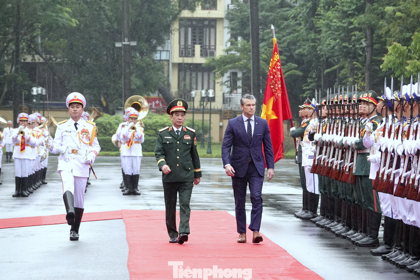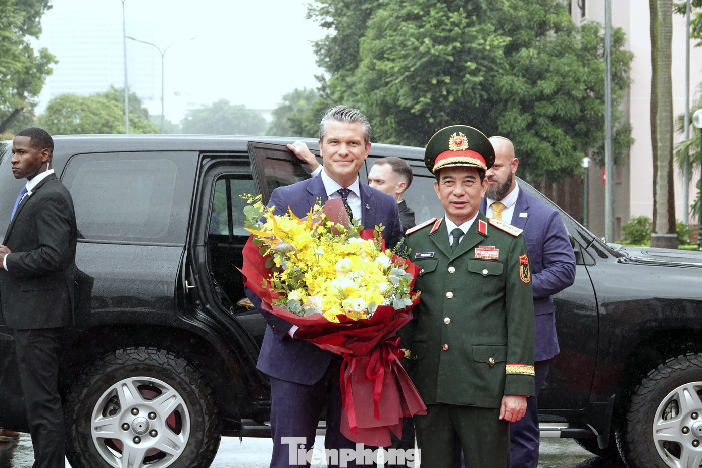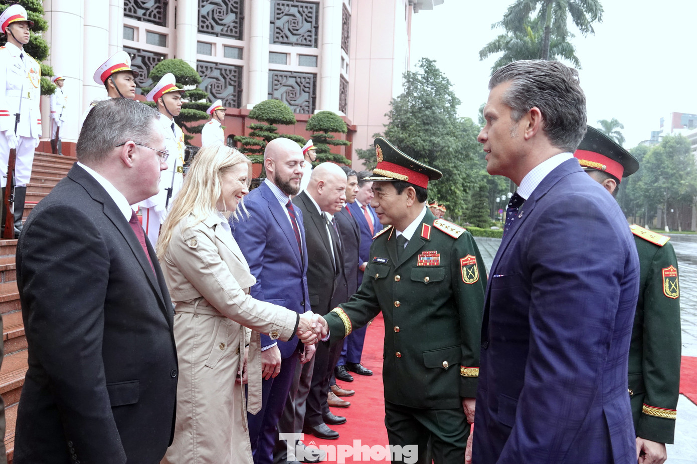 Bộ trưởng Phan Văn Giang đón Bộ trưởng Pete Hegseth tới dự hội đàm cấp cao, tại trụ sở Bộ Quốc phòng. Ảnh: Nguyễn Minh