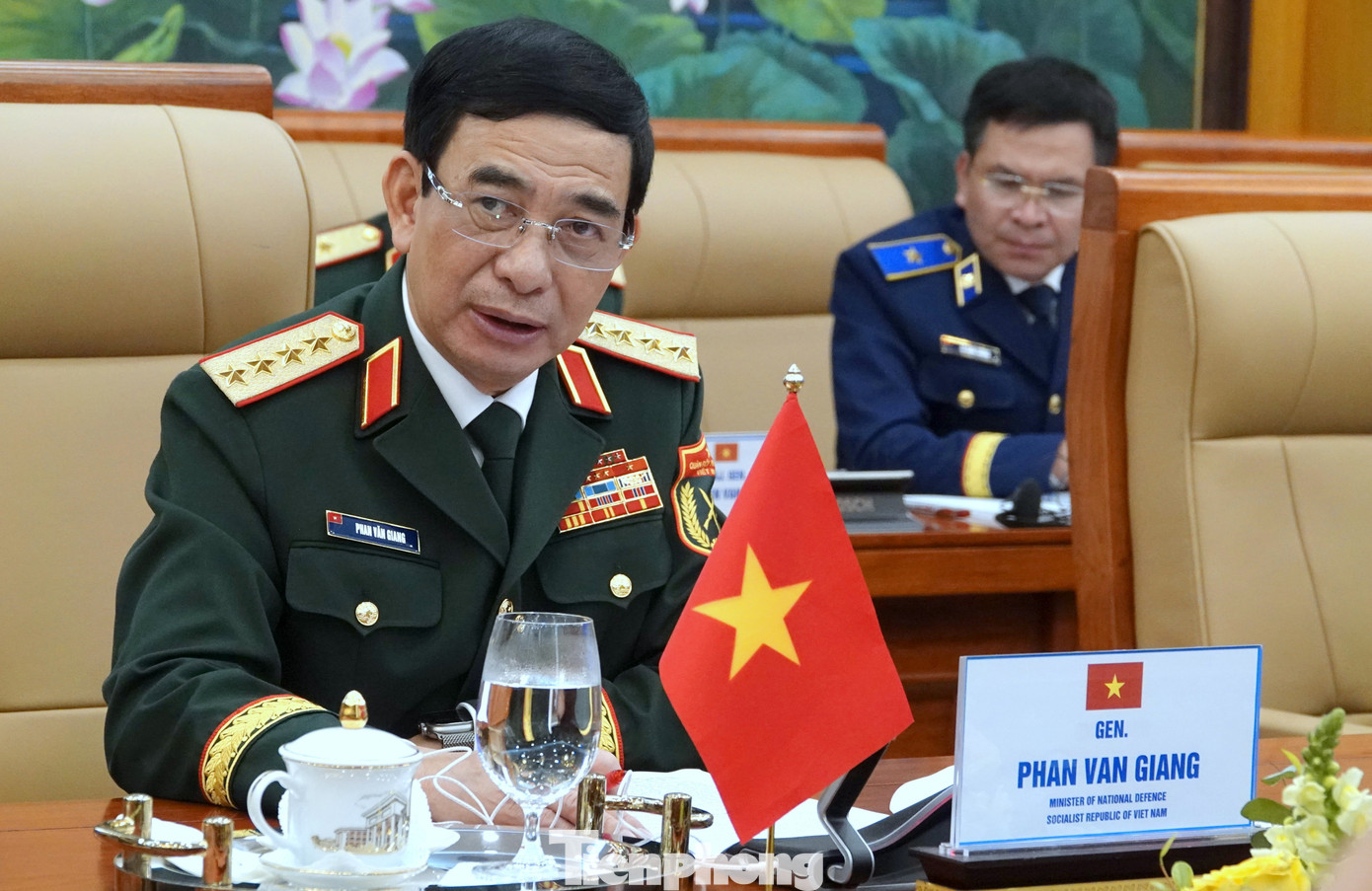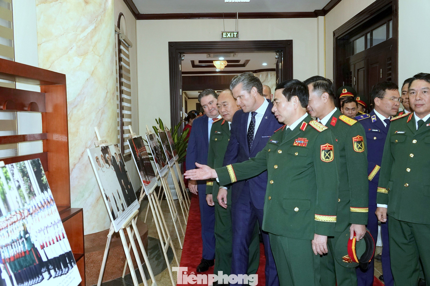 Bộ trưởng Phan Văn Giang giới thiệu với Bộ trưởng Pete Hegseth các hình ảnh phản ánh mối quan hệ hợp tác giữa hai nước.