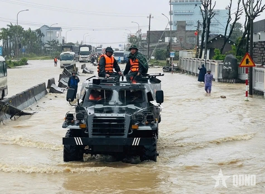 Bộ đội sử dụng xe thiết giáp cứu người và vận chuyển hàng cứu trợ tại vùng mưa lũ tỉnh Đắk Lắk. Ảnh: qdnd.vn