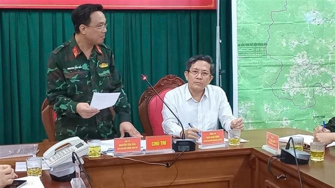Phó Chủ tịch UBND TP. Đà Nẵng Trần Nam Hưng làm việc với Bộ chỉ huy Tiền phương của Bộ Tư lệnh Quân khu 5 trong công tác giúp đỡ đồng bào các xã miền núi TP. Đà Nẵng ứng phó với lũ lụt. (Ảnh: Đoàn Hữu Trung/TTXVN)