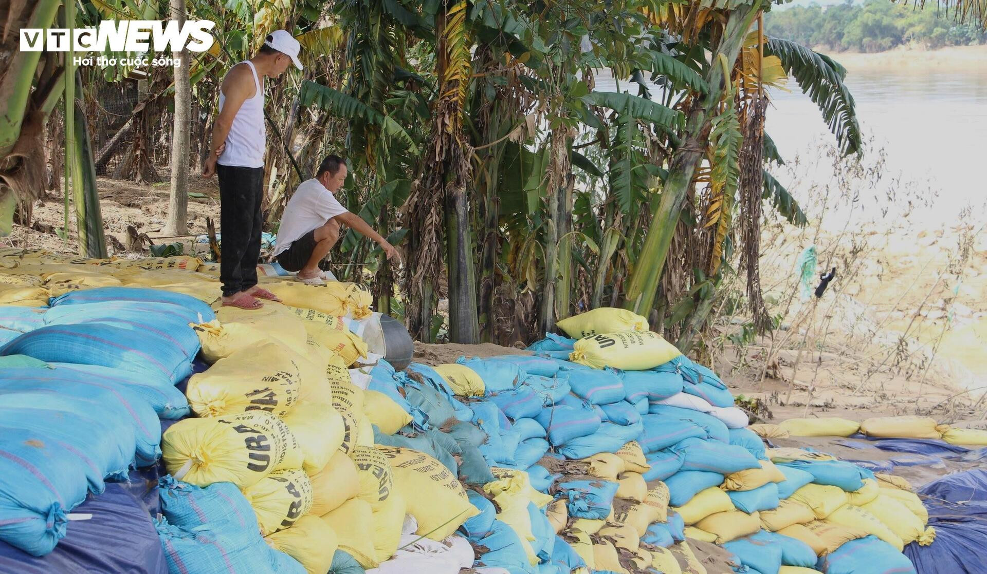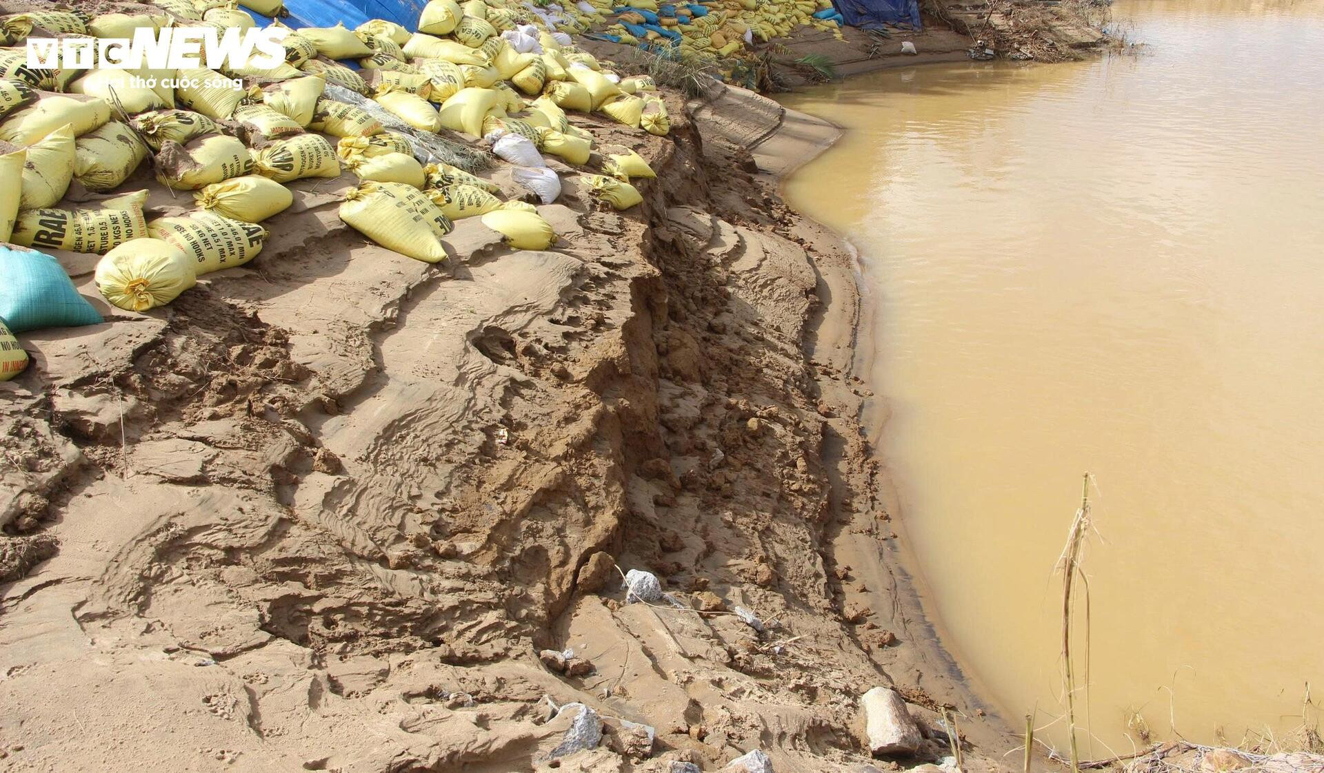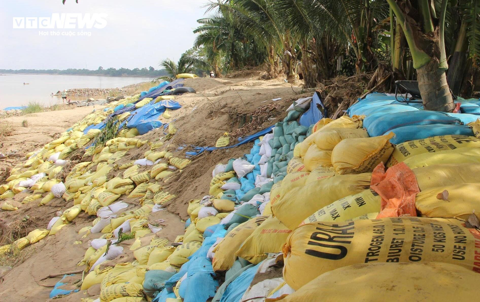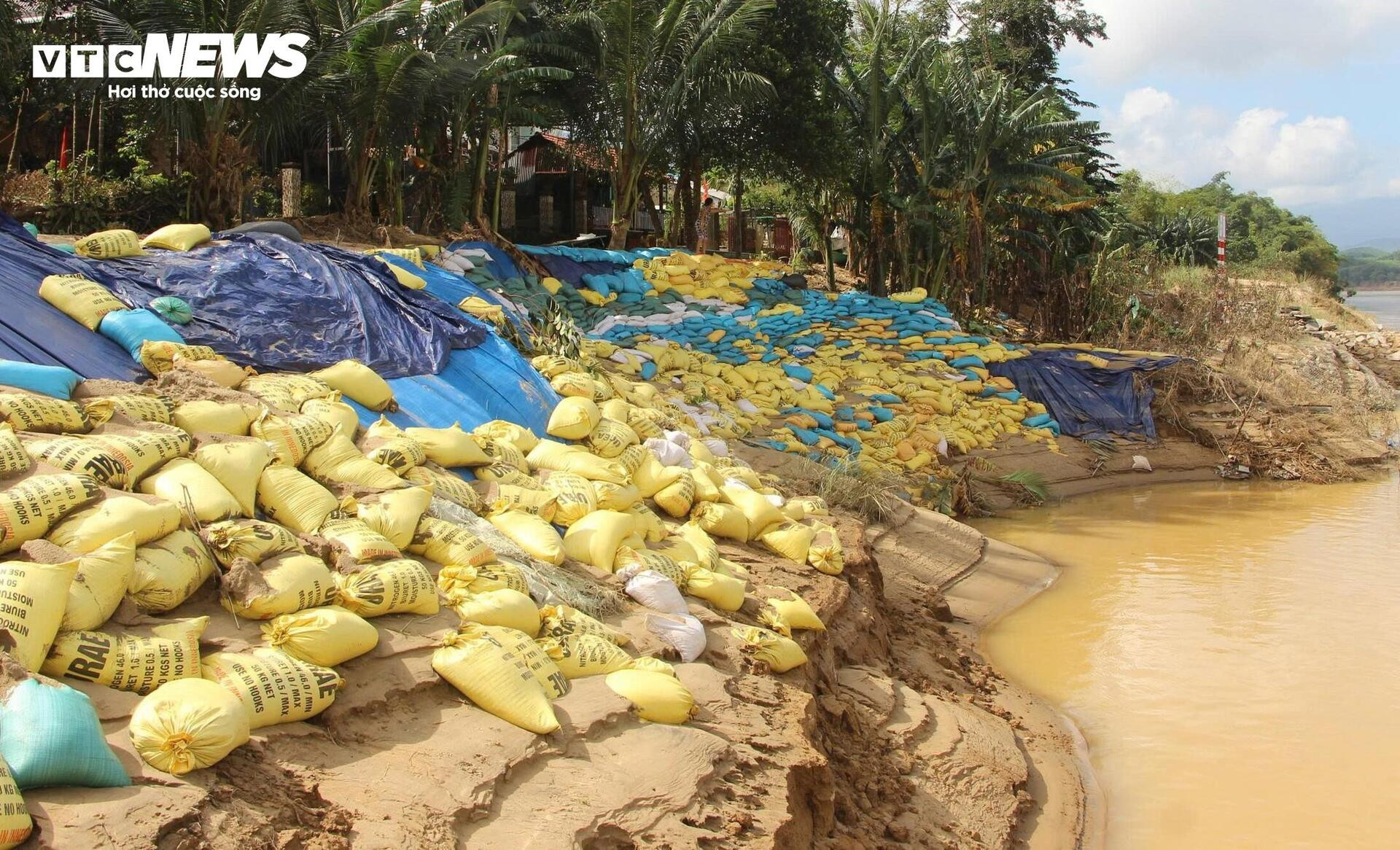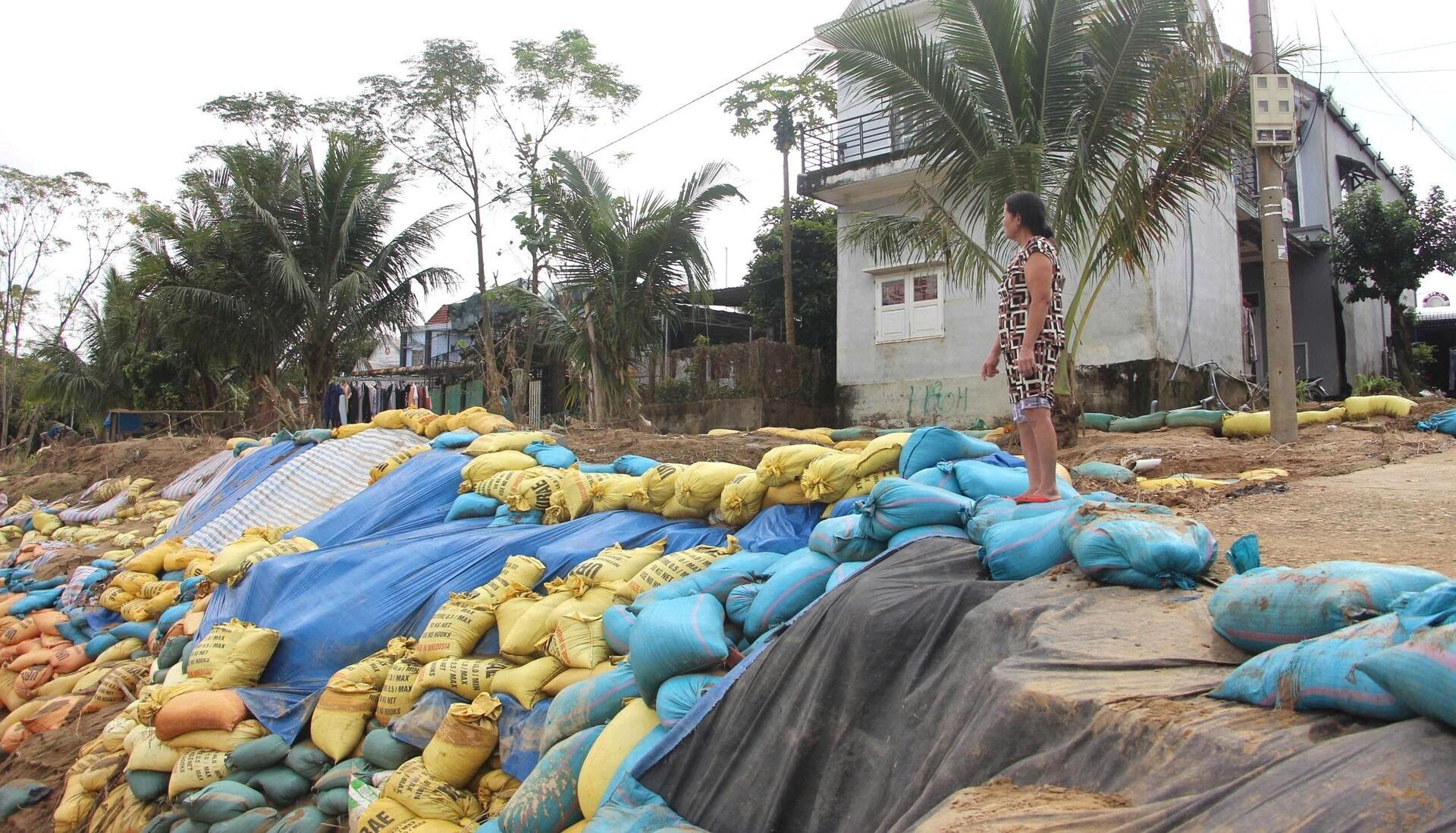 Cả trăm người đã được điều động đến hiện trường sạt lở. Tại đây, hơn 10.000 bao cát đã được đắp dọc bờ sông Thu Bồn nhằm ngăn chặn tình trạng xói lở kinh hoàng khiến người dân bất an.