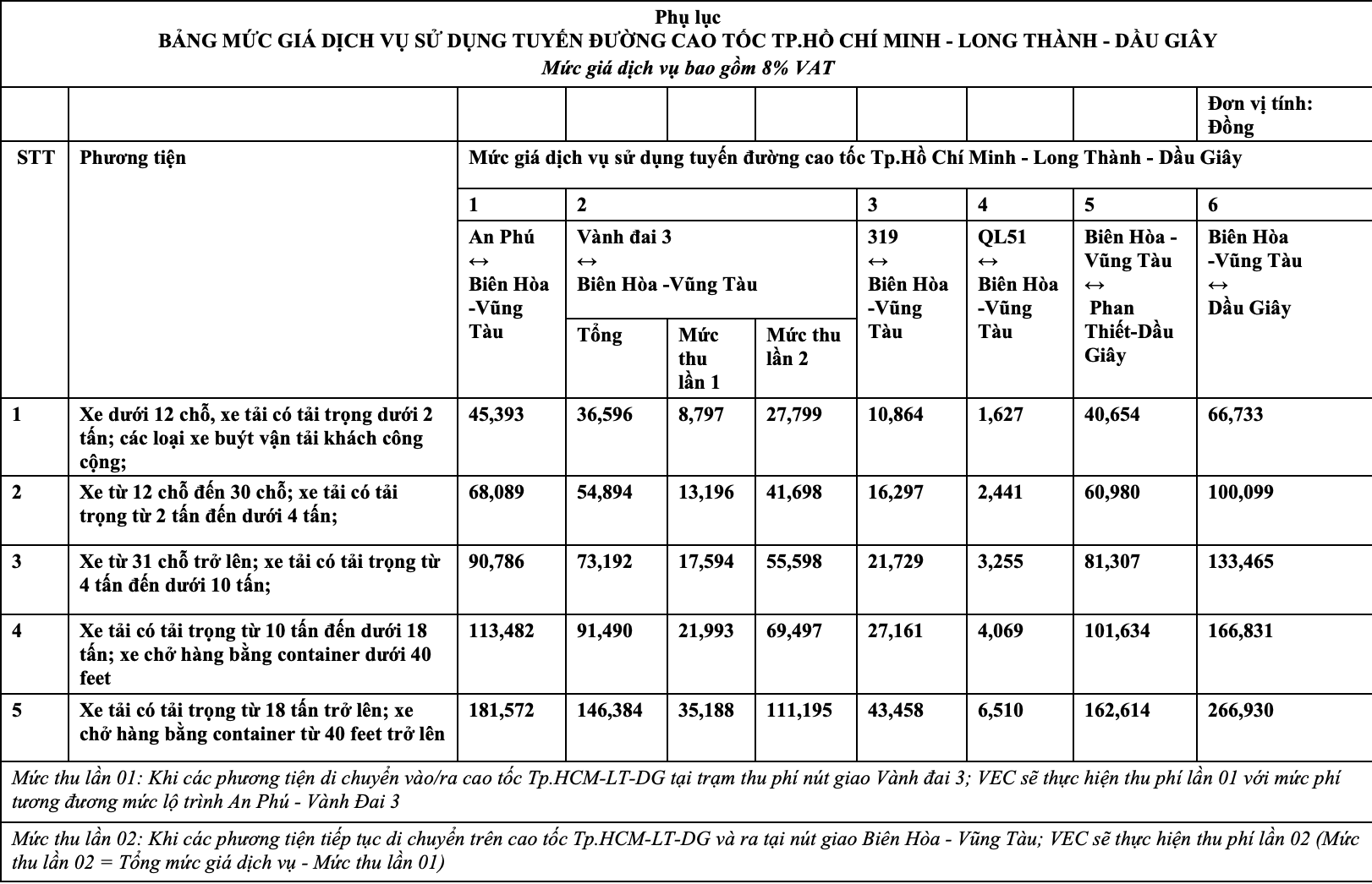 Để bảo đảm hiệu quả đầu tư, cân đối dòng tiền và thực hiện các nghĩa vụ tài chính, VEC sẽ áp dụng bổ sung mức thu phí đối với các phương tiện lưu thông lên xuống tại nút giao Long Thành (kết nối giữa hai tuyến cao tốc nêu trên).