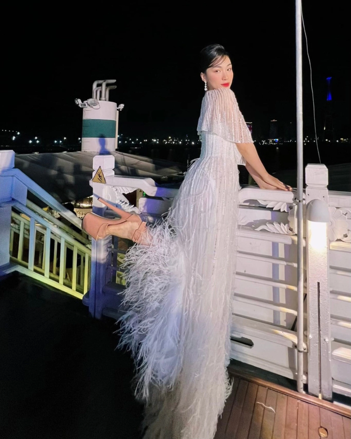 Bên cạnh là đôi sandals trắng có đế độn hơn 32 cm kết hợp quai mảnh tinh tế. Món đồ này thường xuyên xuất hiện trong các sân khấu lớn của Hòa Minzy nhờ khả năng “cân” mọi layout từ váy dài thướt tha đến suit mạnh mẽ.