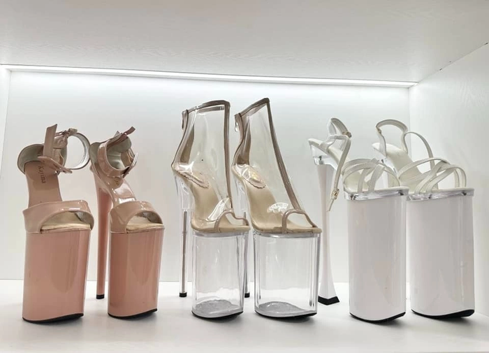 Đôi giày trên 30 cm mà Hoàng Thùy tặng Hòa Minzy (đôi ở giữa) và đôi sandals trắng (phía bên phải).