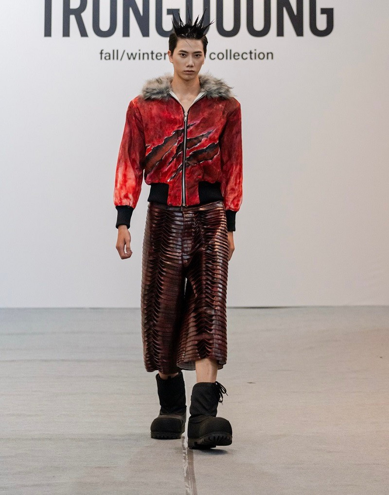 Nhà thiết kế trẻ sử dụng chất liệu da, vải wash, bề mặt mài xước để tạo hiệu ứng thời gian và chiều sâu. Theo Nguyễn Trọng Dương, những chất liệu này tượng trưng cho sức mạnh, bản năng sinh tồn và nét hoang dã chân thực – điều khiến thời trang trở thành “thứ để cảm, không chỉ để mặc”.