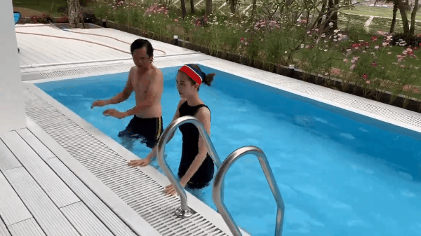 Khi đi bơi cùng gia đình, Ngọc Trinh cũng chọn những mẫu đồ bơi kín đáo hiếm thấy. Cô ưa chuộng những mẫu áo dài tay kết hợp quần dài đến gối hoặc bodyswim dáng quần lửng, hoàn toàn khác biệt so với những thiết kế cắt xẻ táo bạo thường thấy trên tạp chí và sự kiện.