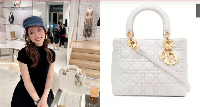Không thể không kể đến Lady Dior thanh lịch với giá khoảng 150 triệu đồng. Túi sở hữu họa tiết Cannage kẻ ô đặc trưng, quai cầm cứng cáp và charm treo chữ D.I.O.R kim loại. Chất liệu da cừu mềm mại, kích thước medium giúp đựng đồ tiện lợi. Mẫu túi này thường xuất hiện trong các set đồ đen trắng cơ bản, phù hợp với gu thời trang của MC Khánh Vy.