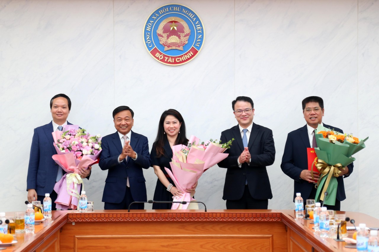 Thứ trưởng Bộ Xây dựng Nguyễn Danh Huy (thứ 2, bên trái) và Thứ trưởng Bộ Tài chính Trần Quốc Phương (thứ 2, bên phải) tặng hoa chúc mừng 3 tân lãnh đạo cấp cục, vụ của Bộ Tài chính. Ảnh: Đức Minh