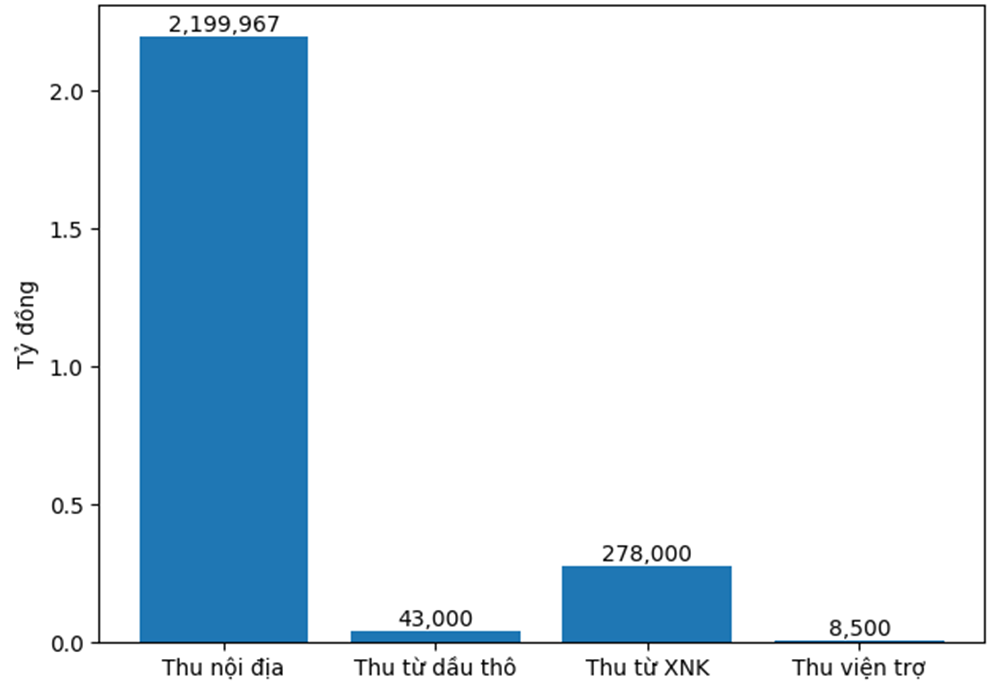 Theo số liệu được công khai, dự toán tổng thu cân đối ngân sách nhà nước năm 2026 là 2.529.467 tỷ đồng, trong đó thu nội địa chiếm tỷ trọng lớn với 2.199.967 tỷ đồng, thu từ dầu thô 43.000 tỷ đồng, thu cân đối từ hoạt động xuất nhập khẩu 278.000 tỷ đồng và thu viện trợ 8.500 tỷ đồng.
