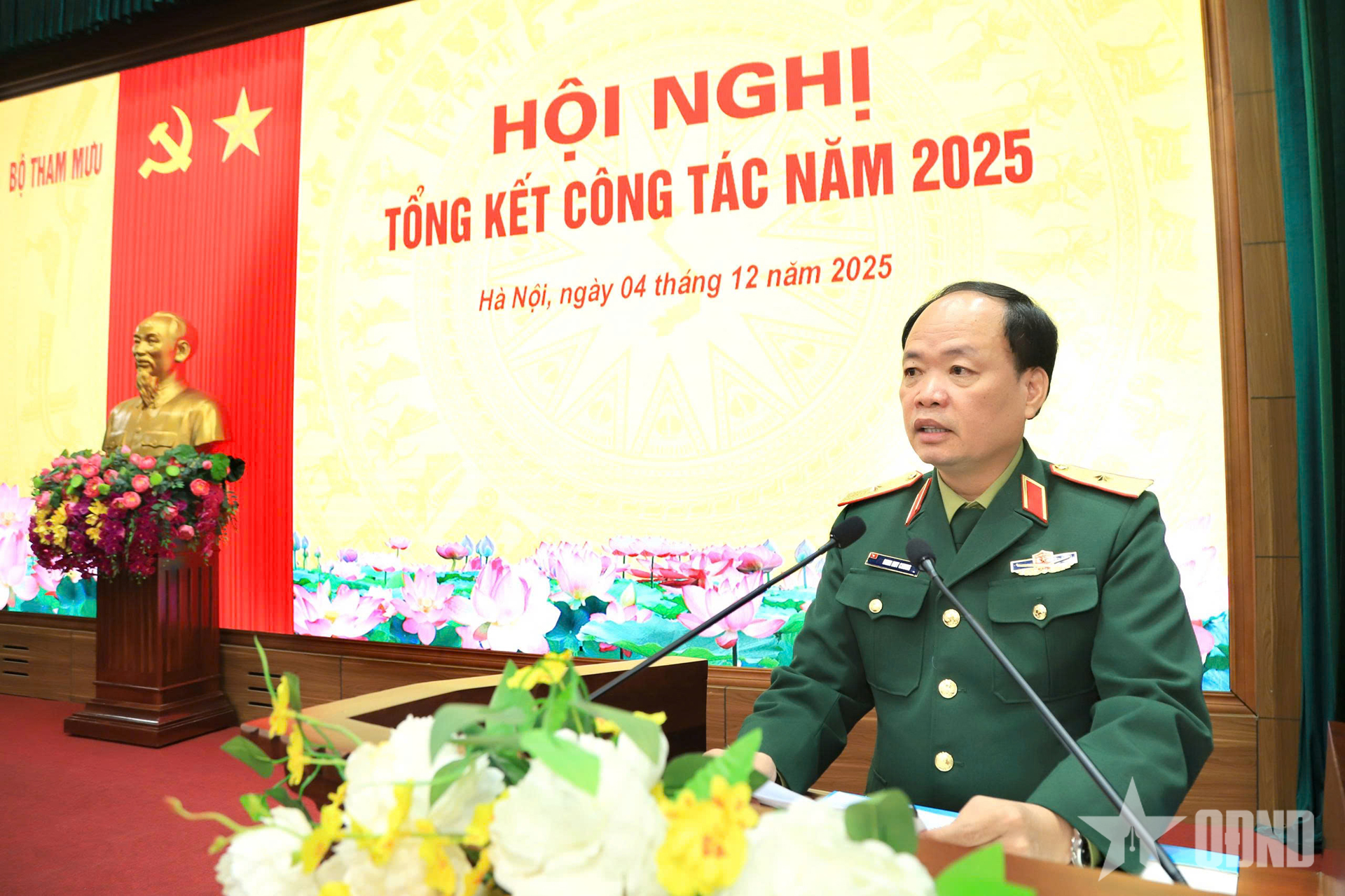 Thiếu tướng Đinh Huy Chung, Bí thư Đảng ủy Bộ Tham mưu, Phó Tham mưu trưởng Tổng cục HC-KT trình bày báo cáo kết quả thực hiện nhiệm vụ năm 2025