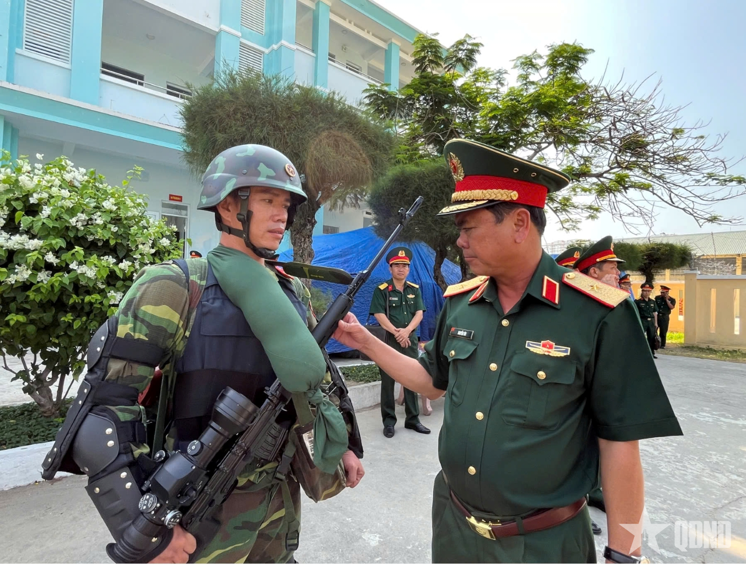 Thiếu tướng Nguyễn Túy, Chỉ huy trưởng Bộ CHQS tỉnh Khánh Hòa kiểm tra bộ đội mang đeo trang bị.