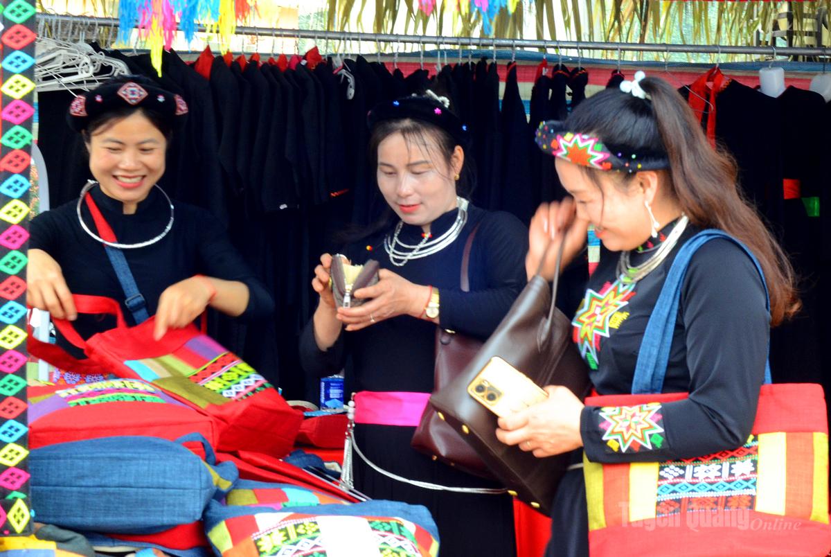 Phụ nữ dân tộc Tày thích thú lựa chọn những sản phẩm thổ cẩm tại gian hàng hội xuân.
