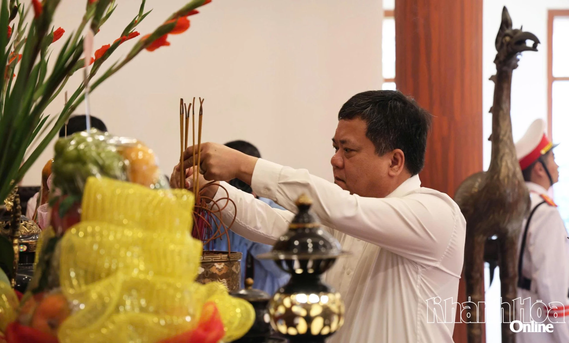 Sáng 17-12, tại Nhà tưởng niệm Chủ tịch Hồ Chí Minh và các anh hùng liệt sĩ Công an tỉnh Khánh Hòa, Đại tướng Lương Tam Quang - Ủy viên Bộ Chính trị, Bí thư Đảng ủy Công an Trung ương, Bộ trưởng Bộ Công an cùng các đồng chí: Nghiêm Xuân Thành - Ủy viên Trung ương Đảng, Bí thư Tỉnh ủy; Trần Phong - Phó Bí thư Tỉnh ủy, Chủ tịch UBND tỉnh; Thiếu tướng Nguyễn Hữu Phước - Ủy viên Ban Thường vụ Tỉnh ủy, Giám đốc Công an tỉnh; lãnh đạo các cục nghiệp vụ Bộ Công an, các đơn vị nghiệp vụ Công an tỉnh đến dâng hoa, dâng hương tưởng niệm Chủ tịch Hồ Chí Minh và các anh hùng liệt sĩ.