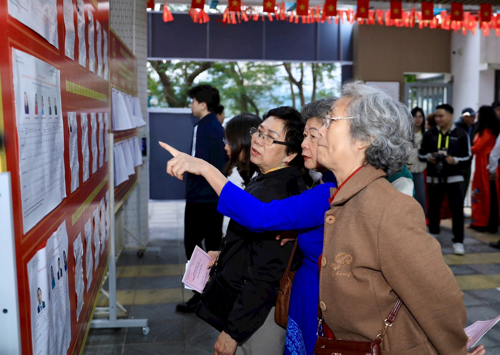 Cử tri phường Giảng Võ tìm hiểu thông tin về các đại biểu trước khi bỏ phiếu. Ảnh: Quang Thái