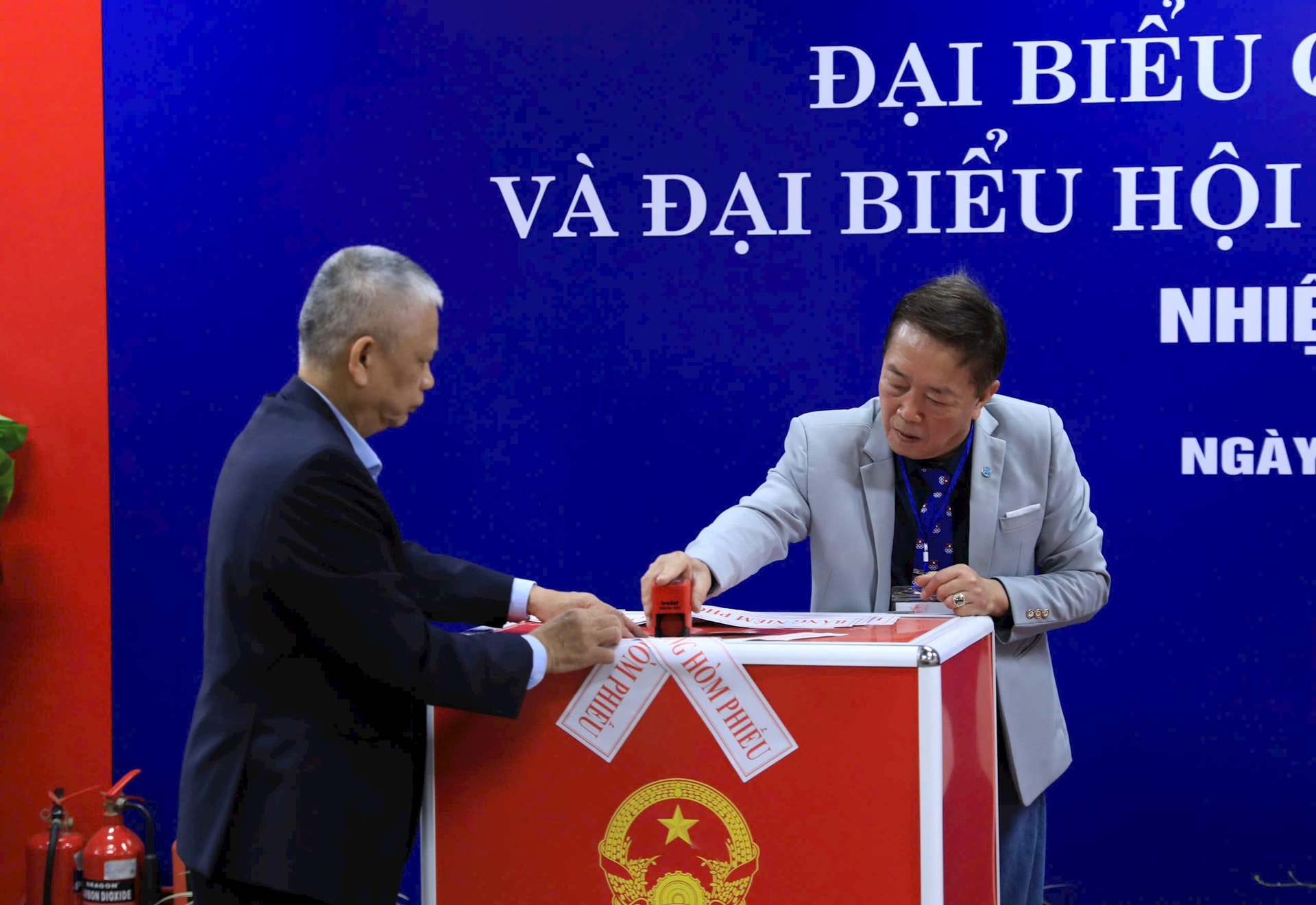 Ban Tổ chức tiến hành kiểm tra hòm phiếu chính, hòm phiếu phụ trước khi bầu cử; niêm phong hòm phiếu chính, hòm phiếu phụ theo quy định. Ảnh: Quang Thái