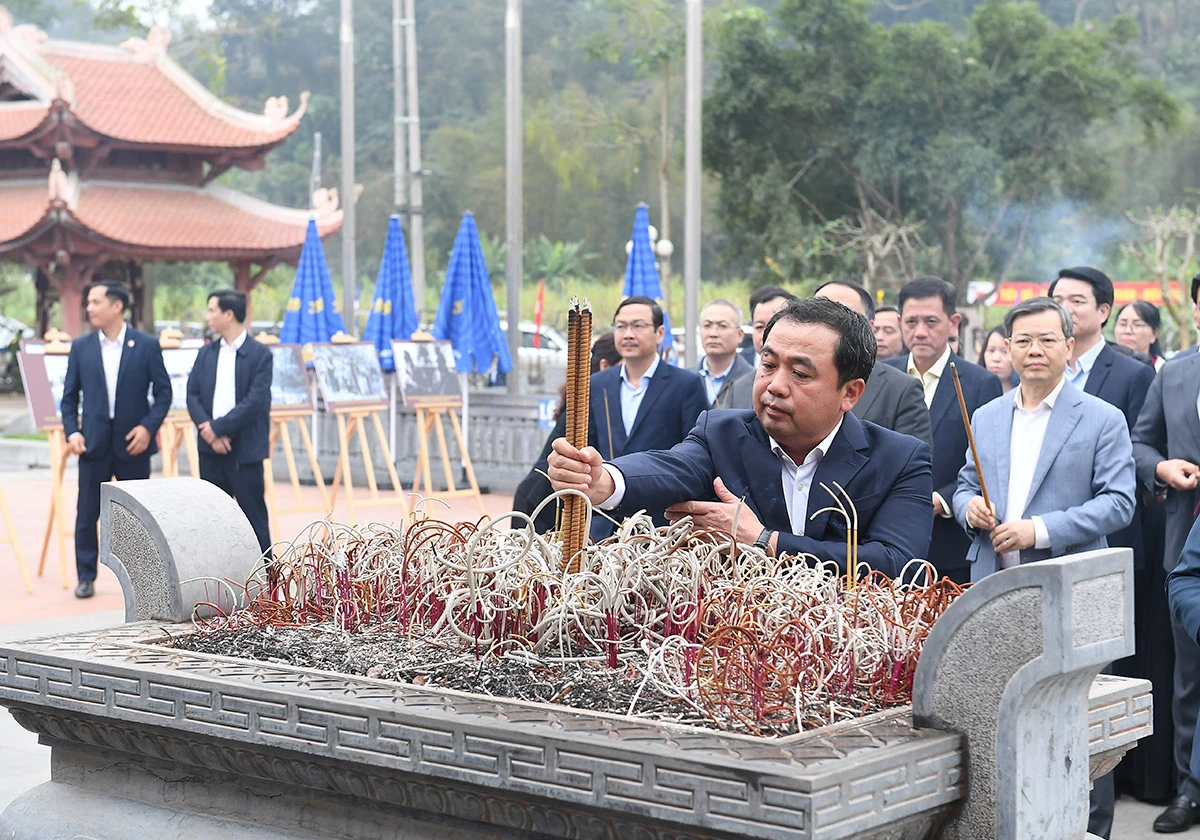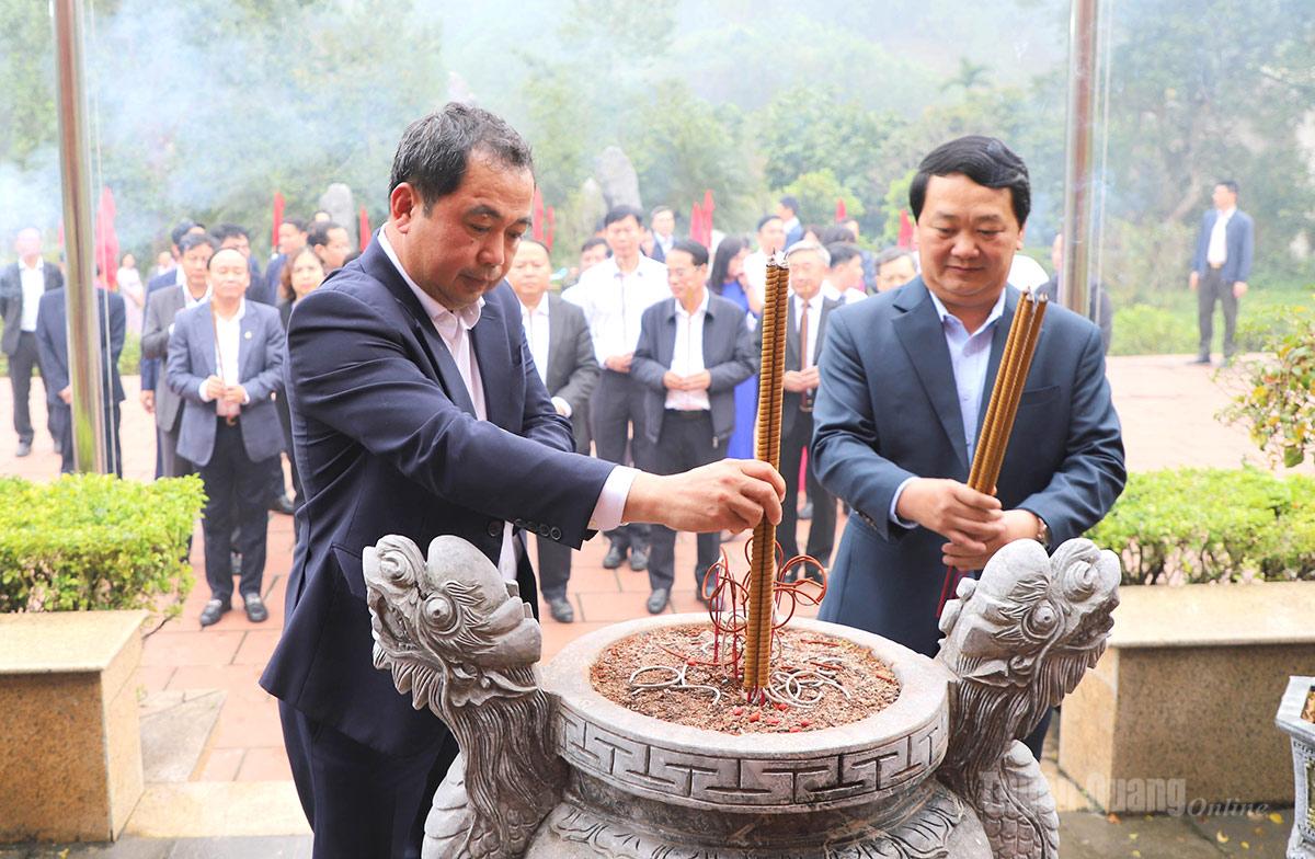 Ủy viên Bộ Chính trị, Bộ trưởng Bộ Nông nghiệp và Môi trường Trần Đức Thắng và Ủy viên Trung ương Đảng, Bí thư Tỉnh ủy Tuyên Quang Hầu A Lềnh thắp hương tưởng niệm tại Khu di tích Bộ Canh nông. Ảnh: Văn Nghị