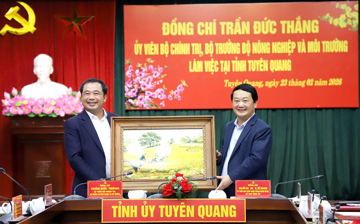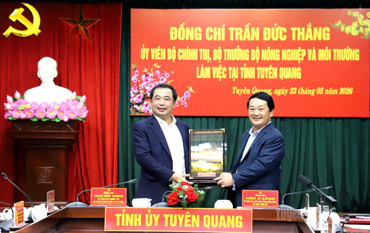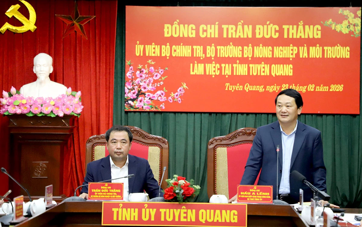 Phát biểu tại buổi làm việc, đồng chí Trần Đức Thắng, Ủy viên Bộ Chính trị, Bộ trưởng Bộ Nông nghiệp và Môi trường đánh giá cao những kết quả ấn tượng mà tỉnh đã đạt được trong giai đoạn 2021-2025. Đặc biệt, Bộ trưởng biểu dương nỗ lực vượt khó của tỉnh trong năm 2025, giai đoạn chuyển giao đầy thách thức sau khi sáp nhập địa giới hành chính. Thấu hiểu những khó khăn đặc thù của địa phương, Bộ trưởng khẳng định Bộ Nông nghiệp và Môi trường có trách nhiệm đồng hành và hỗ trợ sát sao giúp tỉnh phát triển. Bộ trưởng Trần Đức Thắng yêu cầu thủ trưởng các đơn vị trực thuộc Bộ cần dành sự quan tâm thỏa đáng, ưu tiên nguồn lực cho tỉnh Tuyên Quang nói riêng và các địa phương còn gặp nhiều khó khăn nói chung. Đồng thời, Bộ trưởng cũng đánh giá cao tinh thần quyết tâm của tỉnh khi đặt ra các mục tiêu tăng trưởng đột phá cho năm 2026 và định hướng chiến lược giai đoạn 2026-2030.