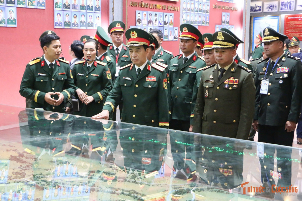 Đại tướng Phan Văn Giang và Đại tướng Tea Seiha cùng các đại biểu tham quan Nhà truyền thống Sư đoàn 5, Quân khu 7.