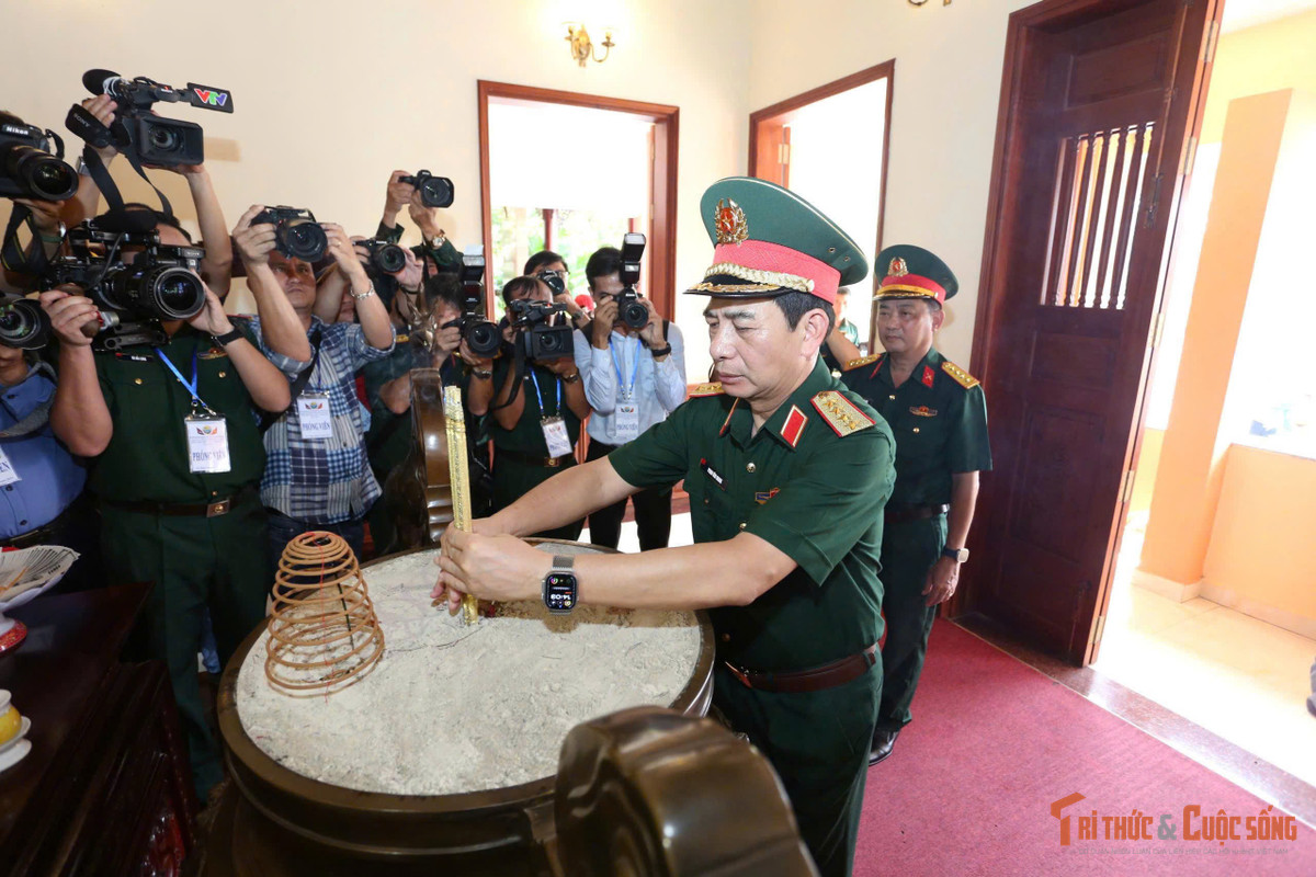 Trước khi làm việc với đơn vị, Đại tướng Phan Văn Giang và đoàn công tác đã dâng hương, dâng hoa tưởng niệm Chủ tịch Hồ Chí Minh tại khuôn viên Nhà Tưởng niệm, bày tỏ lòng thành kính, biết ơn sâu sắc đối với công lao to lớn của Người đối với sự nghiệp cách mạng của dân tộc và Quân đội nhân dân Việt Nam.