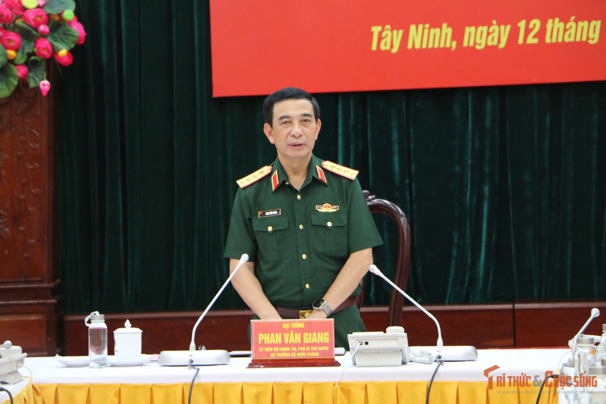 Đại tướng Phan Văn Giang phát biểu, chỉ đạo công tác huấn luyện và chăm lo đời sống bộ đội tại buổi làm việc. Ảnh: Bảo Giang