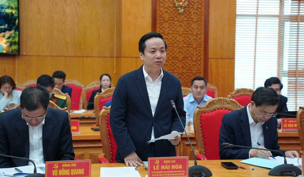 Phó Bí thư Tỉnh ủy, Chủ tịch UBND tỉnh, Chủ tịch UBBC tỉnh Lê Hải Hòa báo cáo tại buổi làm việc.