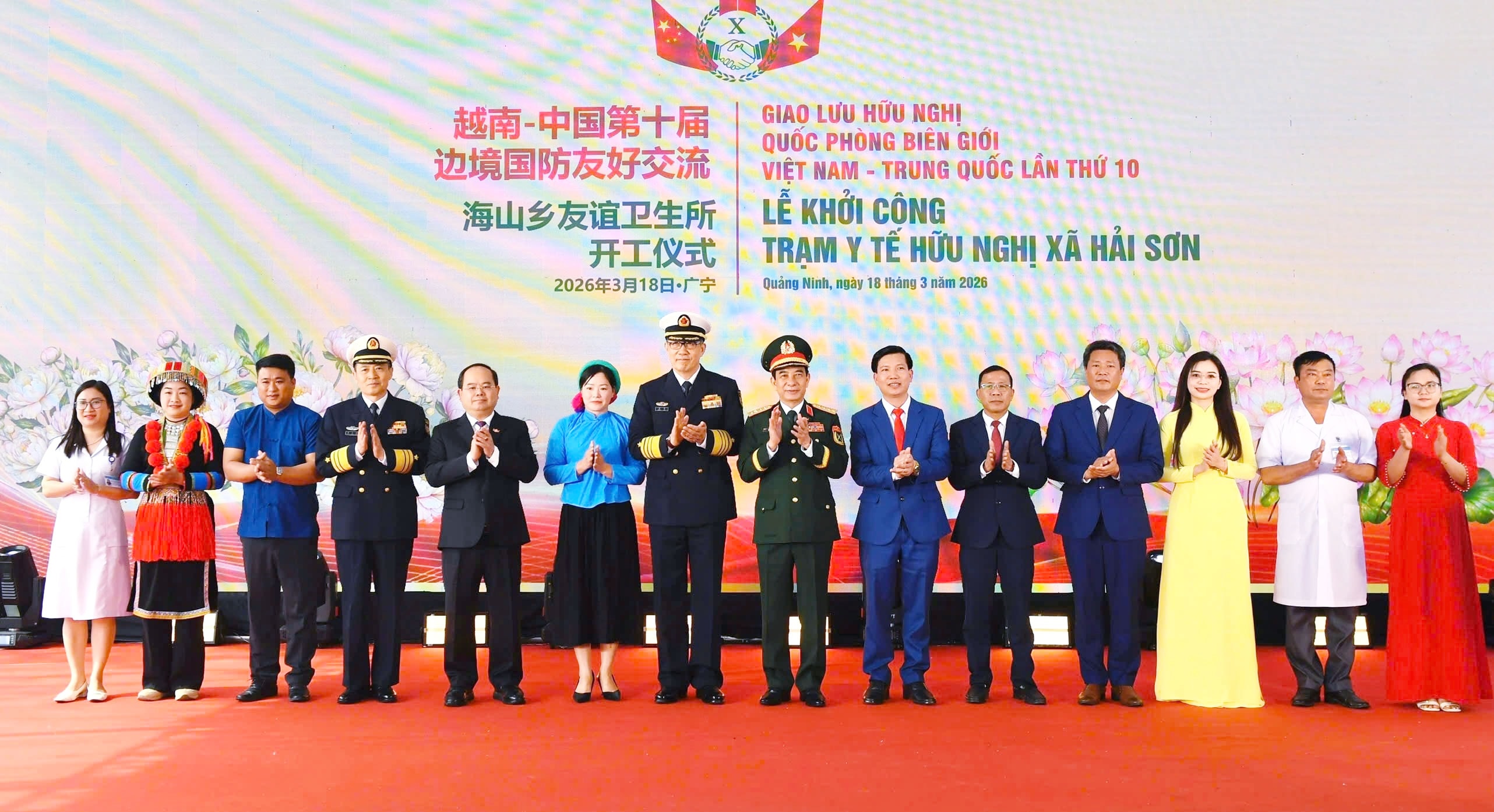 Bộ trưởng Bộ Quốc phòng, Đại tướng Phan Văn Giang; Bộ trưởng Bộ Quốc phòng Trung Quốc, Thượng tướng Đổng Quân và các đại biểu thực hiện nghi thức bấm nút khởi công Trạm Y tế xã Hải Sơn, tỉnh Quảng Ninh