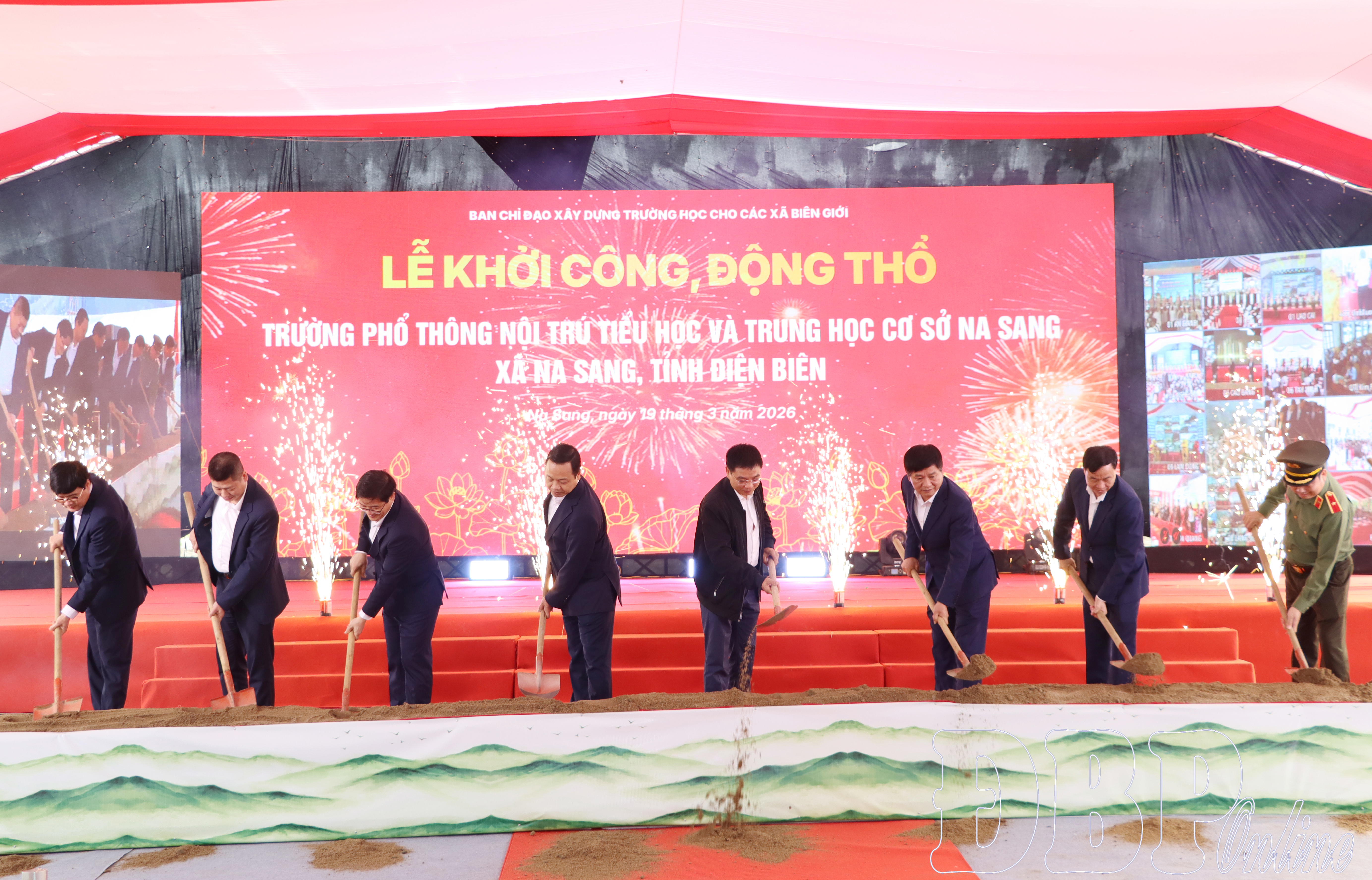 Tại buổi lễ, các đại biểu đã thực hiện nghi thức khởi công, động thổ công trình Trường phổ thông nội trú liên cấp Tiểu học và THCS Na Sang.