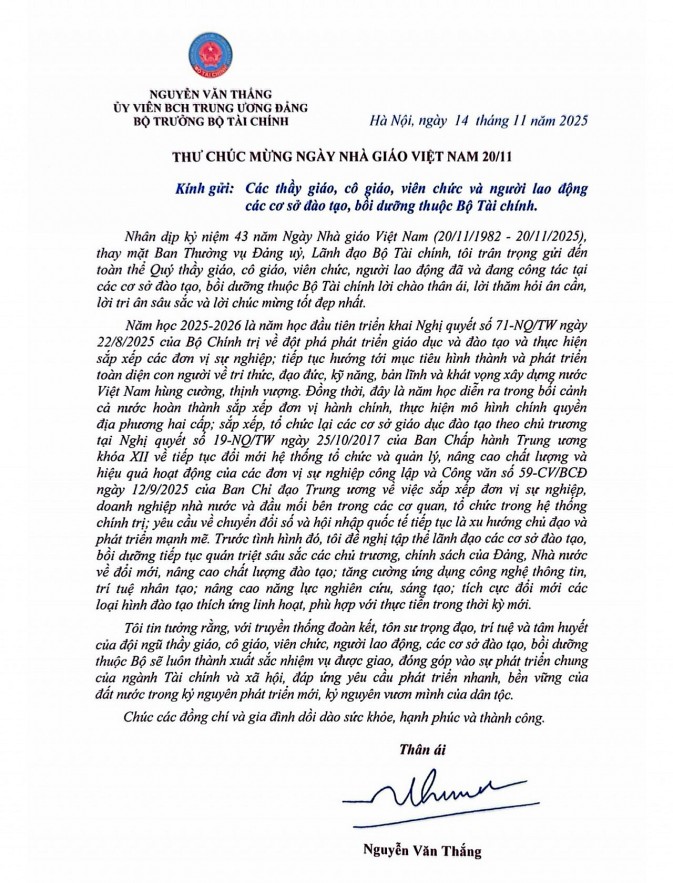 Nhân kỷ niệm 43 năm Ngày Nhà giáo Việt Nam (20/11/1982 - 20/11/2025), Bộ trưởng Bộ Tài chính Nguyễn Văn Thắng đã thay mặt Ban Thường vụ Đảng ủy và lãnh đạo Bộ gửi thư chúc mừng tới toàn thể các thầy giáo, cô giáo, viên chức và người lao động đang công tác tại các cơ sở đào tạo, bồi dưỡng thuộc Bộ Tài chính.