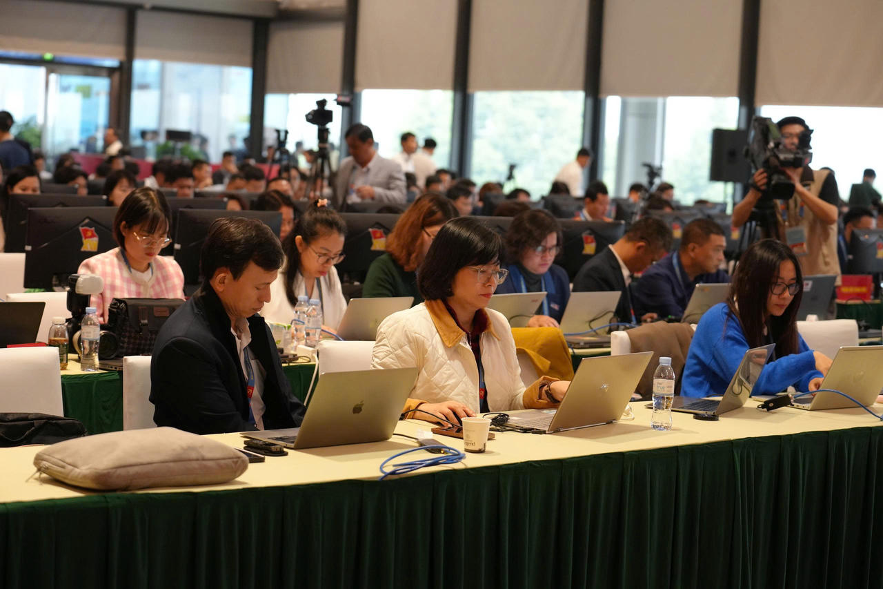 Các nhà báo, phóng viên tác nghiệp tại Trung tâm Báo chí. (Ảnh: Thu Hằng - Vân Anh)