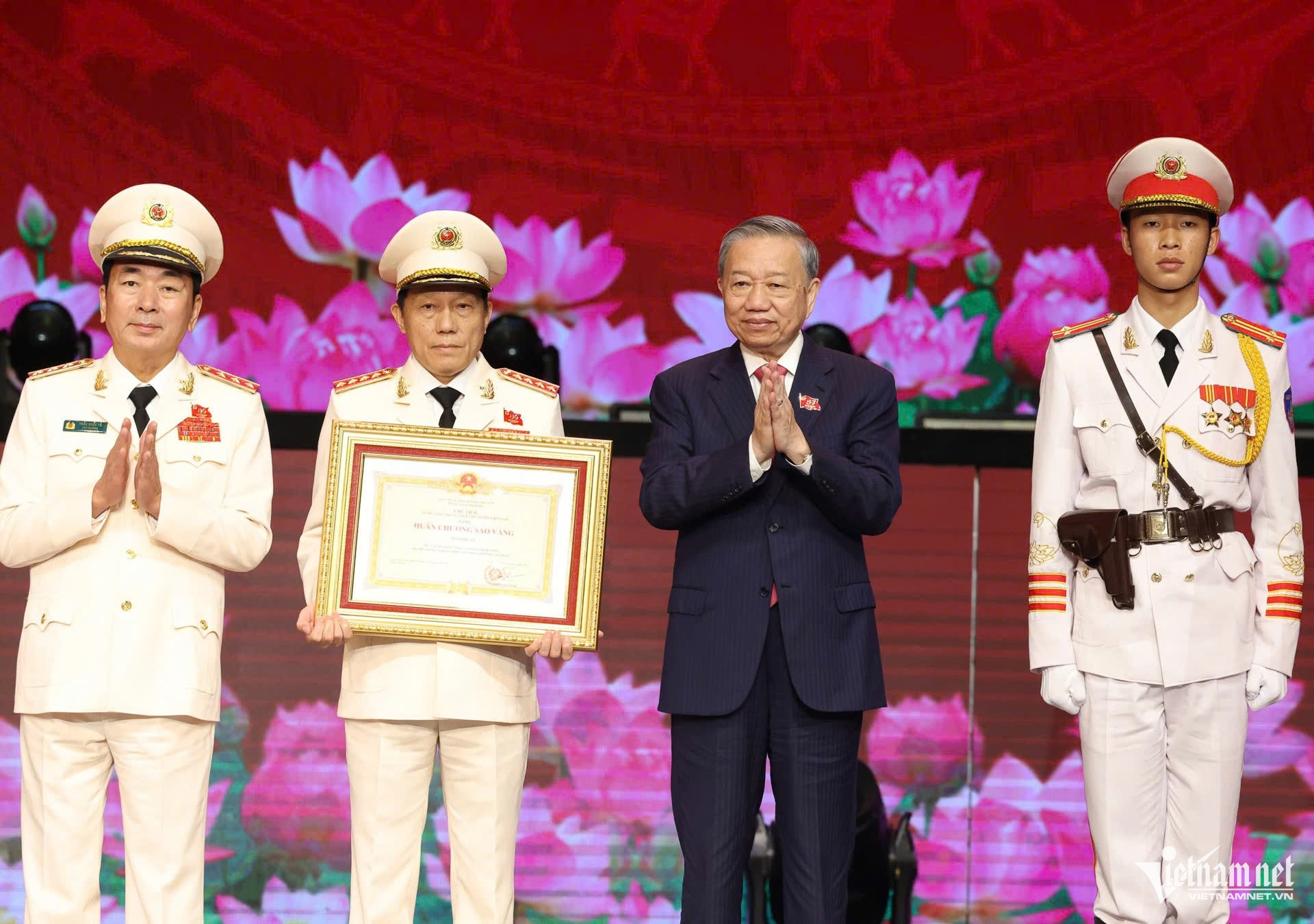 Tại lễ kỷ niệm 80 năm Ngày truyền thống CAND và 20 năm Ngày hội toàn dân bảo vệ An ninh Tổ quốc, thay mặt Đảng, Nhà nước, Tổng Bí thư trao tặng Huân chương Sao Vàng lần thứ 5 cho lực lượng CAND. Ảnh: Phạm Hải