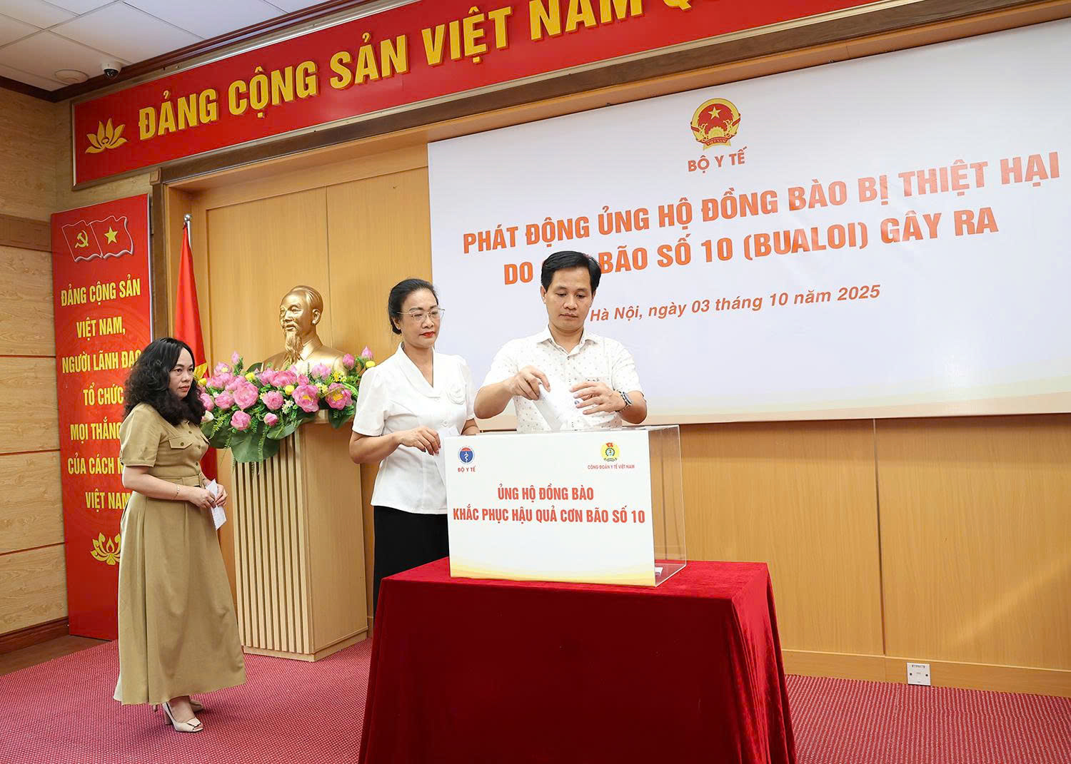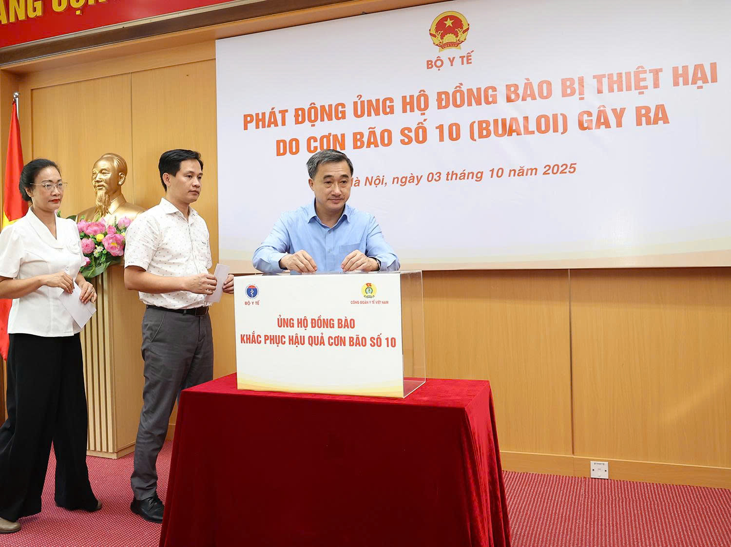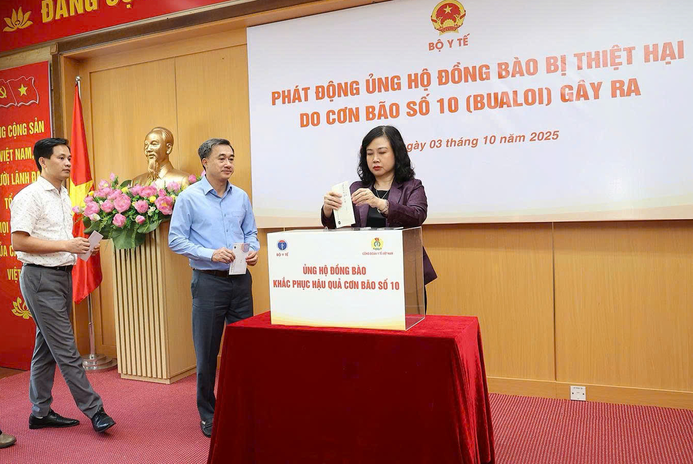 Lãnh đạo Công đoàn Y tế Việt Nam, các Vụ, Cục, Văn phòng Bộ, Viện, Trung tâm... và các cán bộ công chức, người lao động cơ quan Bộ Y tế ủng hộ đồng bào bị ảnh hưởng bão số 10 gây ra.
