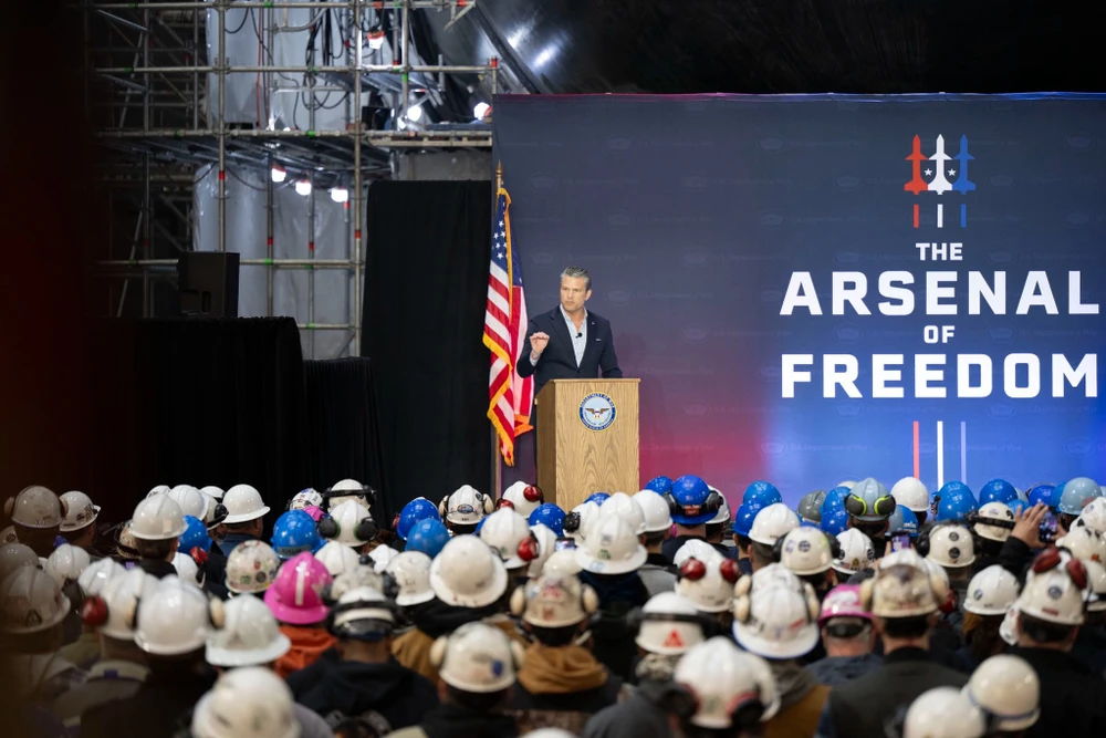 Bộ trưởng Quốc phòng Mỹ Pete Hegseth phát biểu tại xưởng đóng tàu Newport News Shipbuilding ngày 5-1. Ảnh: X