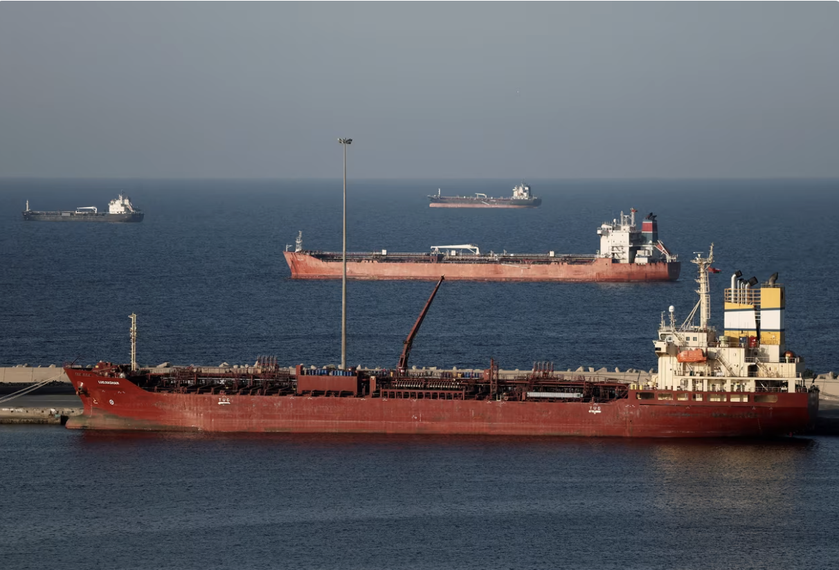 tTàu neo đậu tại Oman, do không thể đi qua eo biển Hormuz. (Ảnh: Reuters)