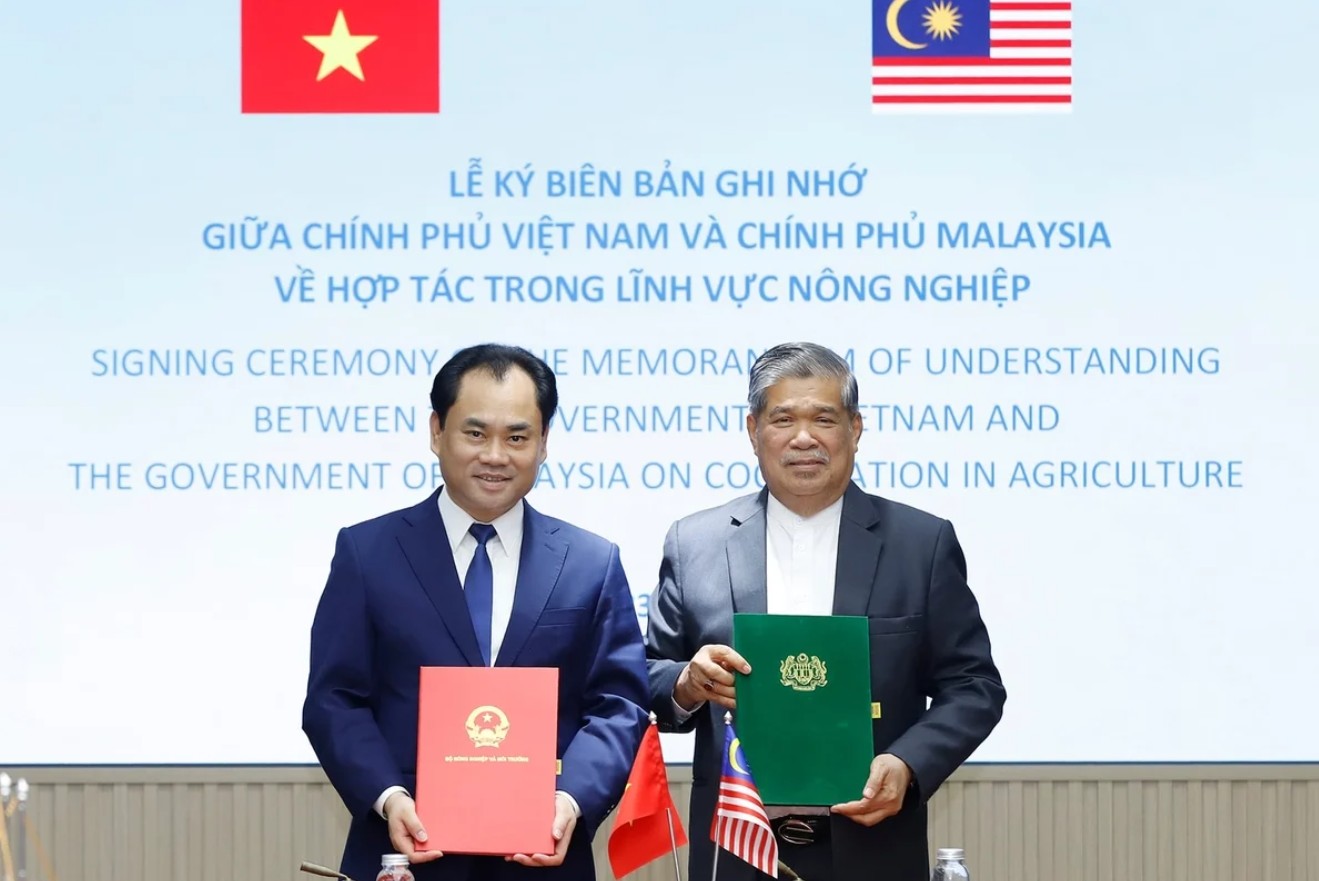 Lễ ký kết MoU ngày 23/4 giữa Bộ trưởng Bộ Nông nghiệp và Môi trường Trịnh Việt Hùng và Bộ trưởng Bộ Nông nghiệp và An ninh lương thực Malaysia Datuk Seri Haji Mohamad Bin Sabu. Ảnh: Bộ Nông nghiệp và Môi trường